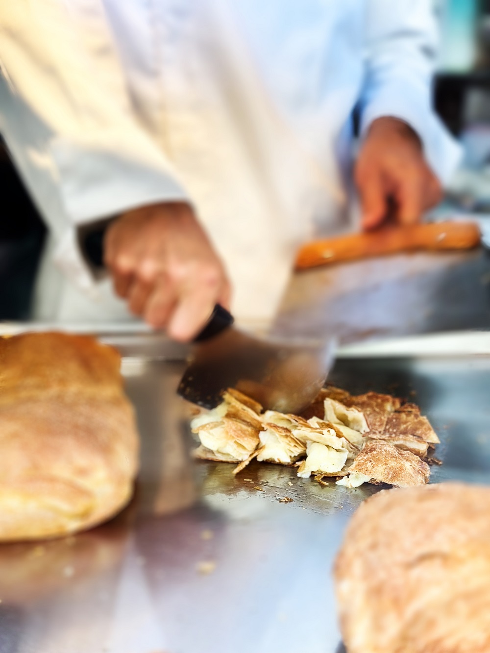 Η ζύμη κόβεται σε μικρά σχετικά μπαλάκια ενώ το καθένα από αυτά ανοίγεται με το χέρι, αρχικά πάνω σε μεγάλη επίπεδη επιφάνεια και κατόπιν με συνεχείς περιστροφές στον αέρα ώστε να γίνει όσο λεπτό χρειάζεται. Το κάθε φύλλο απλώνεται, τυλίγεται γύρω από τη γέμιση πολλές φορές και μπαίνει σε μικρό ταψί για να ψηθεί. Οι, δε, πρώτες ύλες προέρχονται μόνο από συγκεκριμένους παραγωγούς με τους οποίους το μαγαζί διατηρεί πολυετή συνεργασία. Το τυρί το προμηθεύονται από το τυροκομείο του Αρβανίτη έξω από τη Θεσσαλονίκη, τα κρέατα από ένα χωριό έξω από τον Άγιο Βασίλειο και τα λαχανικά από τους Μεταξάδες του Έβρου.