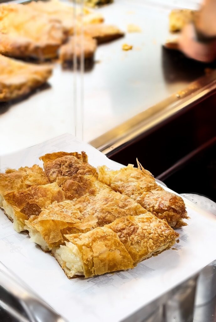 Οι μπουγάτσες του έχουν αναμφίβολα εξαίσια γεύση και ποιότητα. Είναι όσο λιπαρές χρειάζεται, χωρίς να αφήνουν καμία επίγευση λαδιού, έχουν βελουδένια υφή στη γέμισή τους και χαρίζουν ισορροπημένες γεύσεις. Το φύλλο, που έχει κομβικό ρόλο σε μια μπουγάτσα, είναι φυσικά χειροποίητο και μέτρια τραγανό. Για 53 ολόκληρα χρόνια, στο εργαστήρι του μικρού μαγαζιού φτιάχνεται καθημερινά η ζύμη για τα φύλλα αέρος «με συνταγή ιστορίας 300 και βάλε χρόνων», όπως μας είπε ο ίδιος.