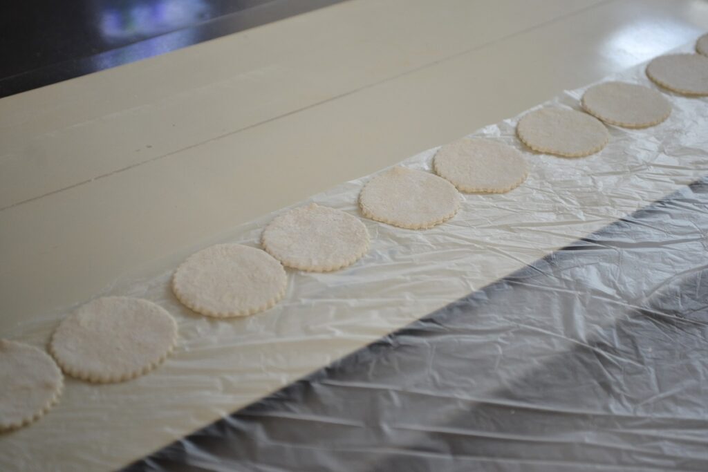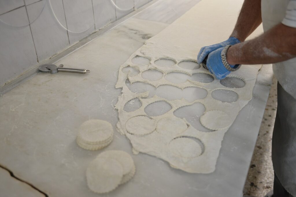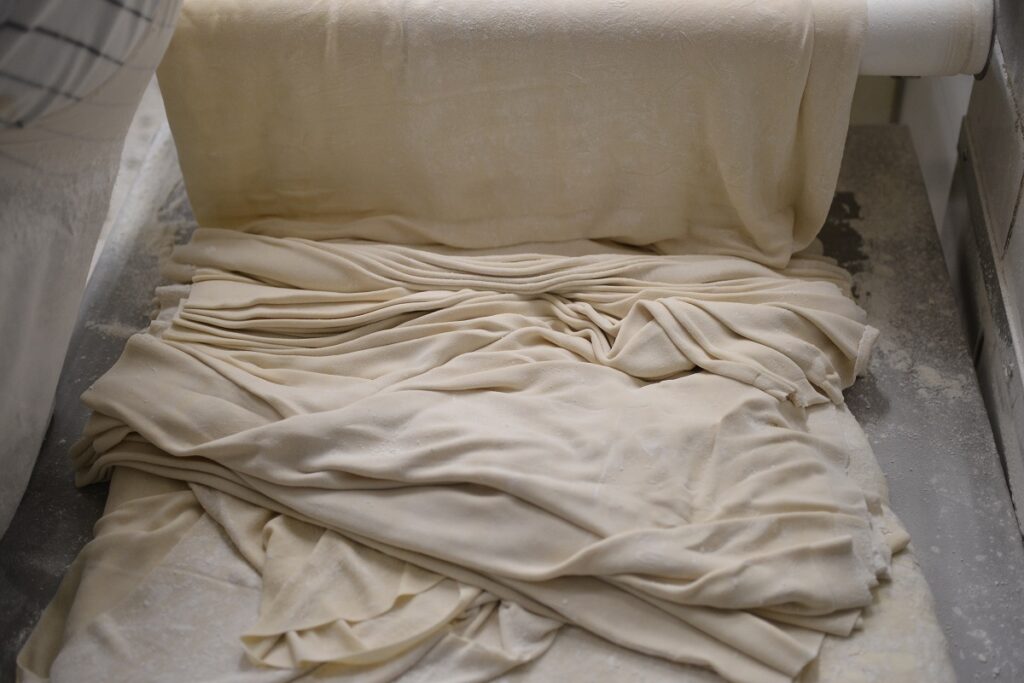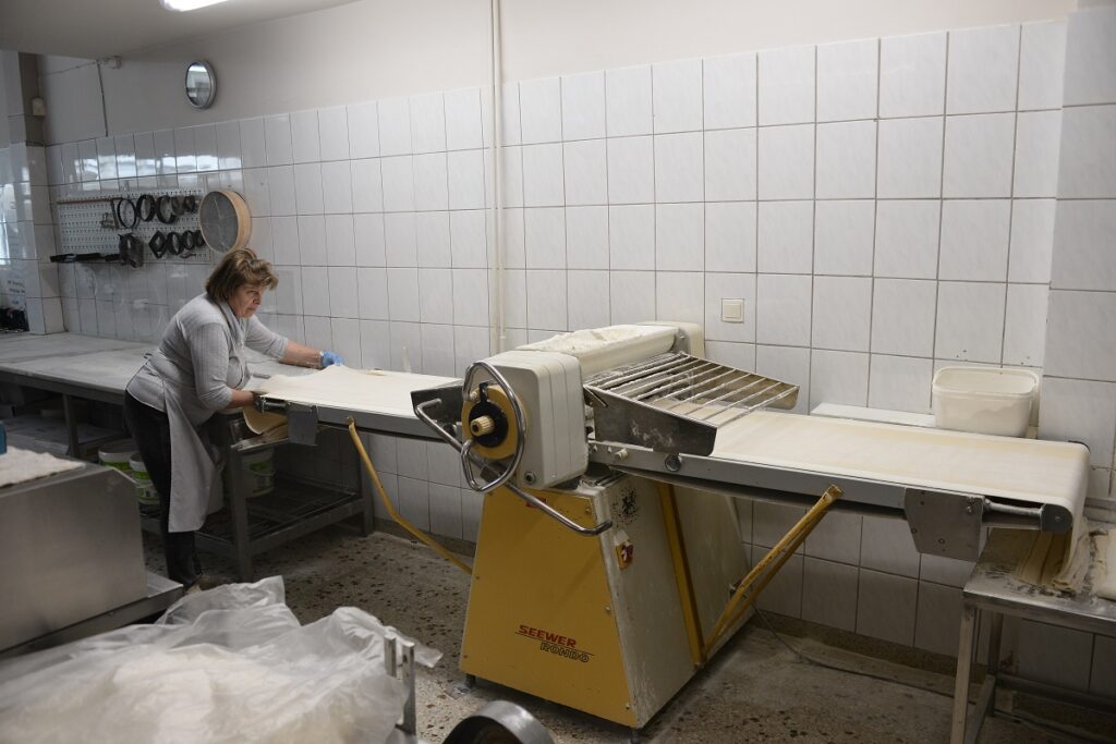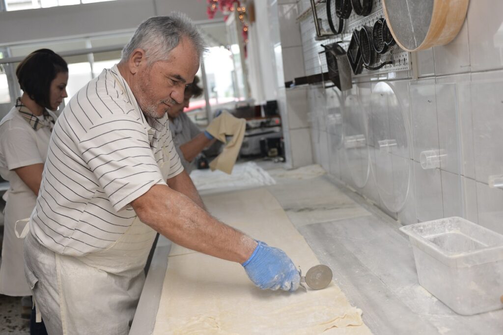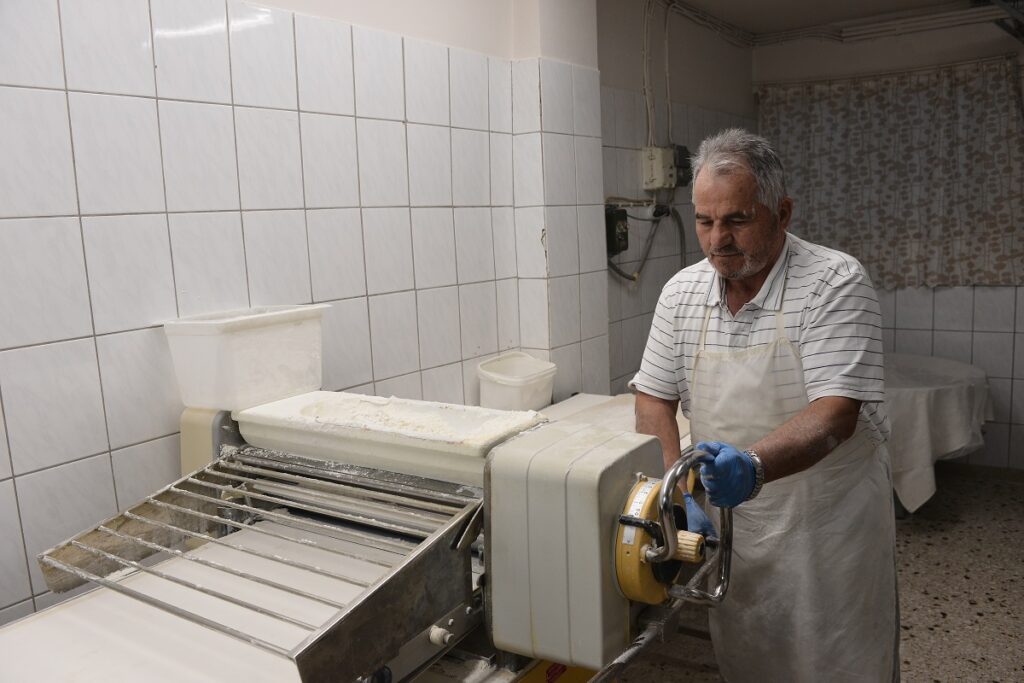 Μιλήσαμε για λίγη ώρα με τον πατέρα για το πώς έφτασε από το φύλλο κανταΐφι σε αυτή τη μεγάλη γκάμα προϊόντων και στη συνέχεια μας έδειξε πώς ανοίγει με τη σύζυγο και τον βοηθό του το κάθε φύλλο και πώς το κόβει για να ετοιμάσει τις πίτες και τα μίνι πιτάκια του. Γιατί εδώ θα βρούμε από νωπό φύλλο βέργας για πίτες παραδοσιακού τύπου και κατεψυγμένο φύλλο σφολιάτας μέχρι φύλλα για κρέπες, αλλά και κατεψυγμένες κρέπες γεμισμένες με ζαμπόν, τυρί, μπέικον, σουτζούκι.