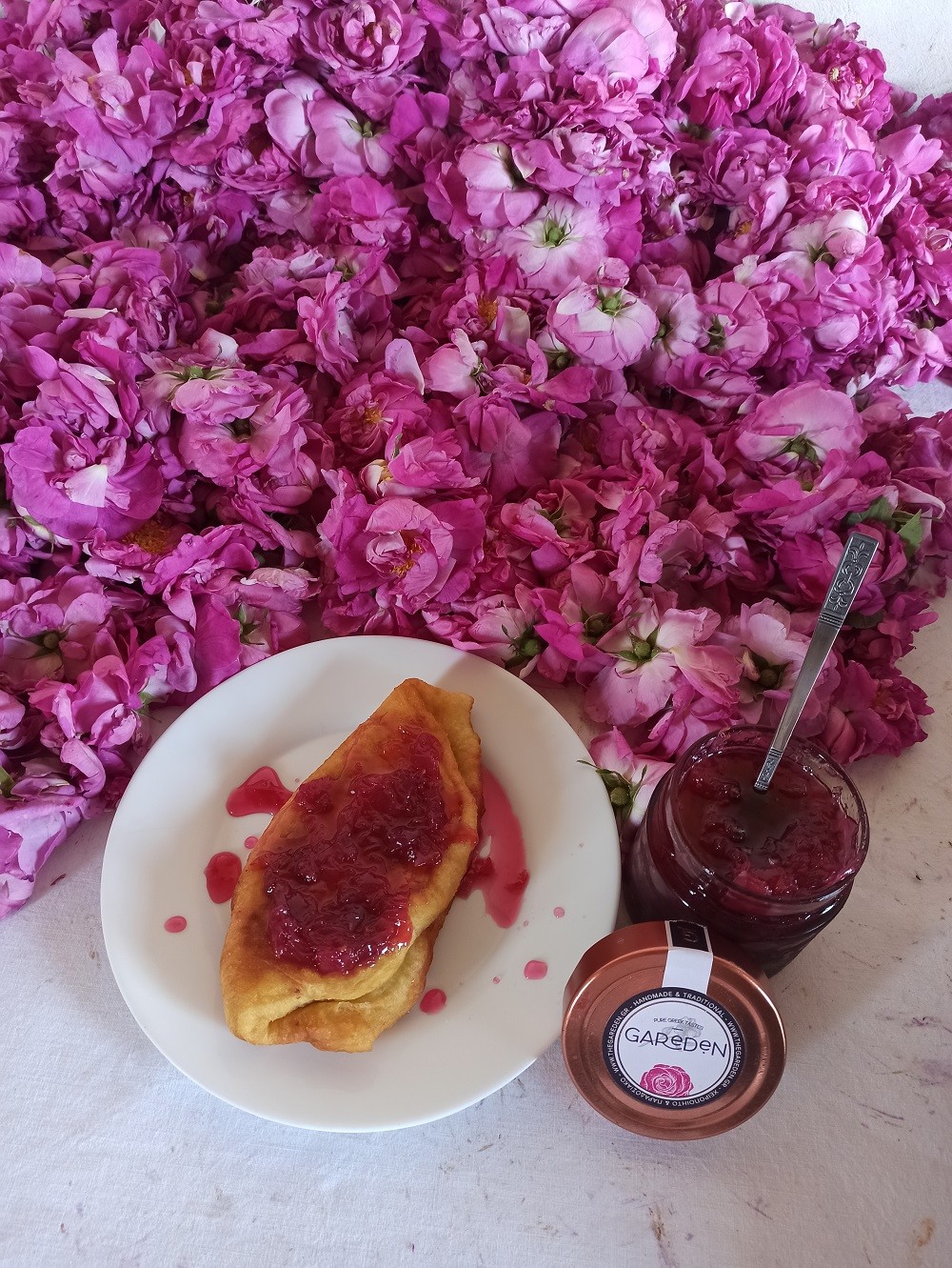 Κάθε υλικό λαμβάνει ειδική φροντίδα προκειμένου να διατηρηθεί ζωηρό και γευστικό μέσα στα γλυκά: «Τα τριαντάφυλλα τα καλλιεργούμε οι ίδιοι, η συγκομιδή γίνεται νωρίς κάθε πρωί και στη συνέχεια μαδάμε τα πέταλα. Είναι μία διαδικασία που ολοκληρώνεται με την παρασκευή και συσκευασία του γλυκού καθημερινά προκειμένου να διατηρούν στο έπακρο το άρωμα και τη φρεσκάδα τους, για όλη την περίοδο της ανθοφορίας τους. Το βύσσινο και το περγαμόντο τα αγοράζουμε φρέσκα από τοπικούς παραγωγούς, σε μικρές παρτίδες κάθε φορά ώστε να μη μαραίνονται, προχωράμε αμέσως στην αφαίρεση του κουκουτσιού και την αποφλοίωση αντίστοιχα – και στη συνέχεια στην παρασκευή και στη συσκευασία των γλυκών».