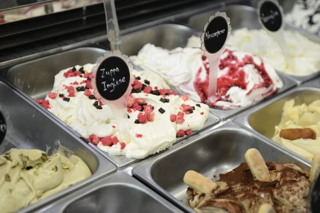 Εκτός από το ψυγείο με τα γλυκά και τις τούρτες στον χώρο υπάρχει όλο τον χρόνο ψυγείο με παγωτό. Φτιάχνει γύρω στις 50 διαφορετικές γεύσεις συνολικά, οι οποίες εναλλάσσονται ανάλογα με την εποχή και τα φρέσκα υλικά της, ενώ υπάρχουν και κάποιες εμβληματικές γεύσεις που βρίσκουμε πάντα, όπως το φιστίκι με πάστα από το Bronte της Σικελίας, το τιραμισού, το τζούπα ινγκλέζε (από το διάσημο ιταλικό γλυκό).