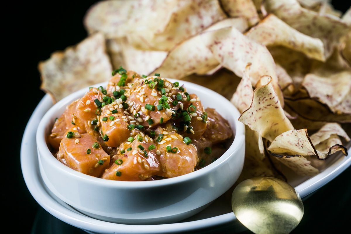 Η μπάρα του «28 Hong Kong Street» (πάνω) φιλοξενεί ένα εύρυθμο cocktail soundtrack όπου σιγοντάρουν value for money snacks και πιάτα όπως το χαβανέζικο Poke με σολομό (κάτω)