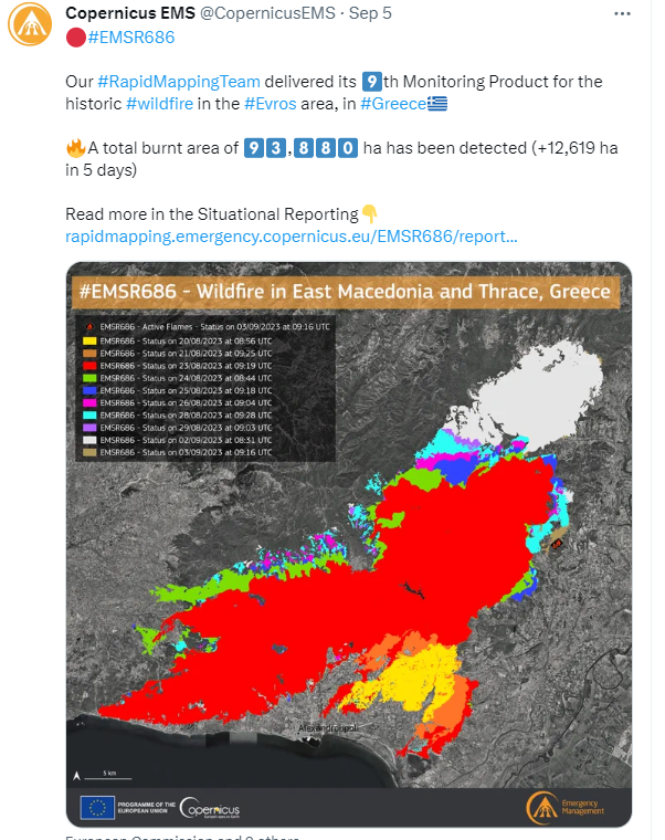 Την ίδια μέρα, ενεργοποιείται η υπηρεσία Copernicus EMS Rapid Mapping της Ευρωπαϊκής Ένωσης, που συλλέγει δορυφορικές και επίγειες περιβαλλοντικές πληροφορίες και στην πρώτη εκτίμηση χαρακτηρίζει την πυρκαγιά της Αλεξανδρούπολης ως «Ακραία Επικίνδυνη» (very extreme danger). Στις 3 Σεπτεμβρίου καταγράφει ότι κάηκαν 93880 εκτάρια και στις 8 Σεπτεμβρίου ότι σταματάει την παρακολούθηση καθώς η φωτιά έχεις σβηστεί πλήρως.