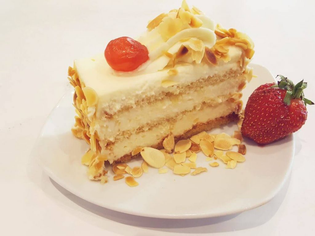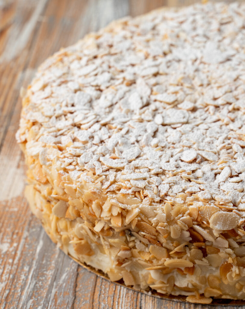 Τριπλή στρώση από καλά σιροπιασμένο παντεσπάνι και πληθωρικές δόσεις κρέμας ζαχαροπλαστικής που καταλήγουν σε ένα παχύ στρώμα από σαντιγί. Αυτή η βερσιόν της πάστας αμυγδάλου έχει όλη την απολαυστική γλύκα και τη φρεσκάδα που επιβάλλει η παραδοσιακή εκδοχή αυτού του γλυκού. Η επιλογή εξαιρετικών υλικών και η πίστη στην κλασική συνταγή είναι τα μυστικά της.