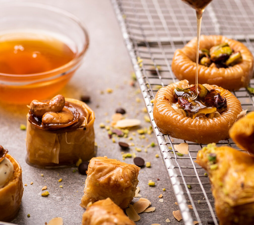 Τα τραγανά μίνι σιροπιαστά του μοσχομυρίζουν μέλι και βούτυρο γι αυτό τρώγονται δύο δύο. Ο μπακλαβάς σε κομμάτι (μερίδα) ή οικογενειακό ταψάκι είναι τόσο λαχταριστός που δύσκολα μπορεί να του αντισταθεί κάποιος.
