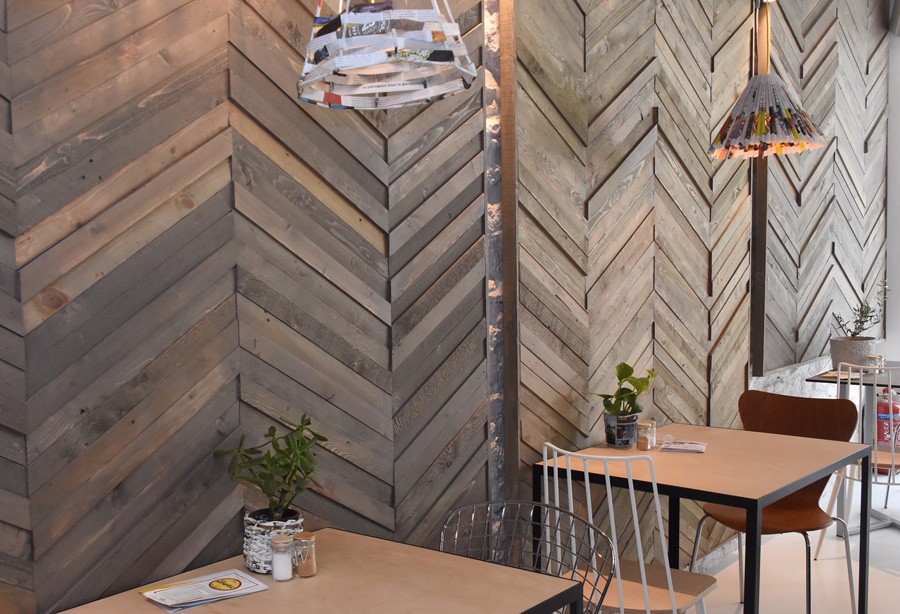 Πάνω: Πέρα από κοινωνικό χαρακτήρα, το project «σχεδία home» έχει και περιβαλλοντική διάσταση. Ένα από τα χαρακτηριστικά παραδείγματα, ο τοίχος που είναι επενδυμένος με πανέλ ξύλου που έχει ξαναχρησιμοποιηθεί. Κάτω: Κορνίζες με δράσεις όπου συμμετέχουν άνθρωποι της «σχεδίας». Φωτογραφίες: Παναγιώτης Κουφαλέξης
