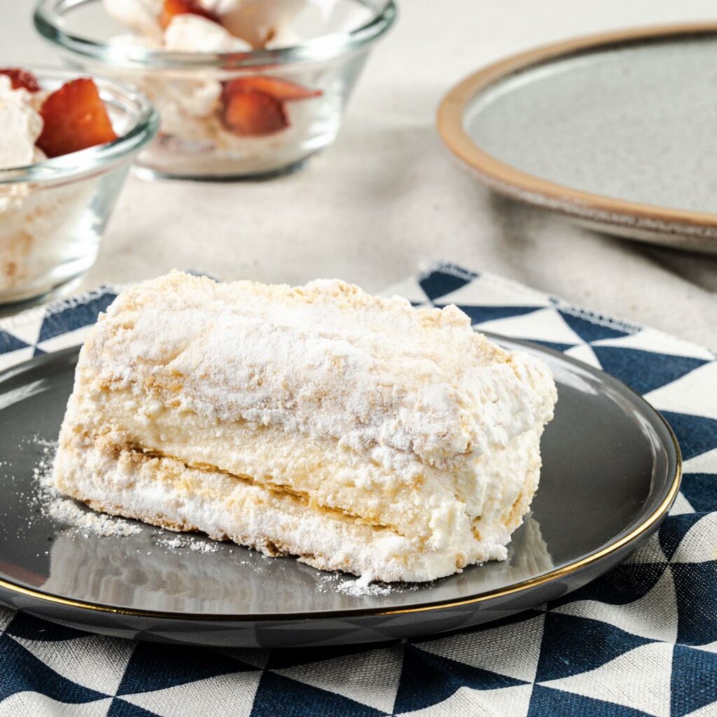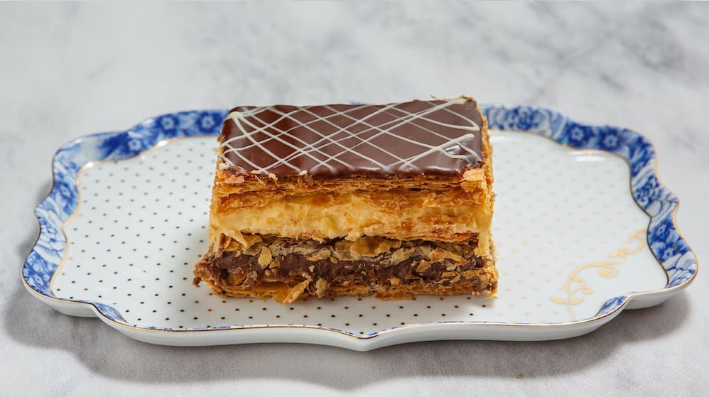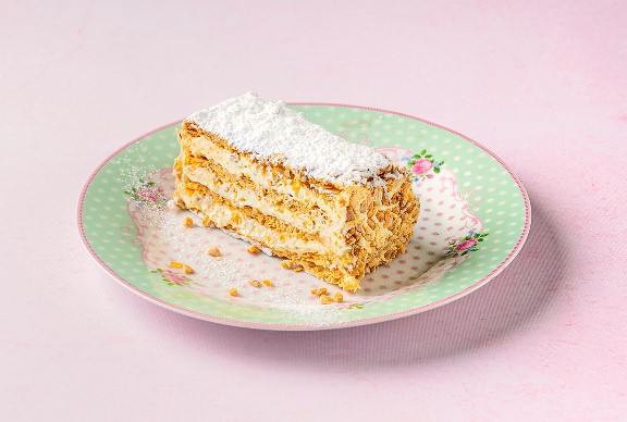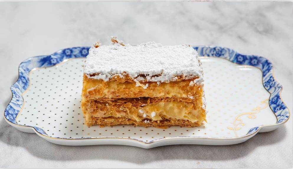 Αυτό το γλυκό είναι κυριολεκτικά αφρός, σαν βανιλένιο σύννεφο. Old school εμφάνιση με αρκετή άχνη να το σκεπάζει, κρύβει μέσα του τις παραδοσιακές τεχνικές και τα κορυφαία υλικά που το ιστορικό αυτό ζαχαροπλαστείο χρησιμοποιεί με ευλάβεια σε κάθε δημιουργία που νγαίνει από το εργαστήριό του. Η βανίλια δηλώνει ηχηρά την παρουσία της στη γαλατένια κρέμα ενώ τα φύλλα που τη συγκρατούν πάνω και κάτω μοσχοβολάνε βούτυρο.