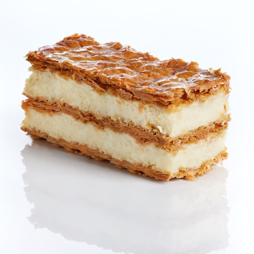 Σχεδόν τετράγωνο και φουσκωτό το γαλλικό αυτό αριστούργημα είναι λουσμένο με τριμμένο φύλλο και άχνη, σαν χιονισμένο βουνό. Μέσα είναι γεμάτο κρέμα, γλυκιά και μαλακή, ενώ τα φύλλα του είναι όσο πρέπει βουτυράτα και τραγανιστά. Και το καλύτερο; Eίναι πάντα φρέσκο.