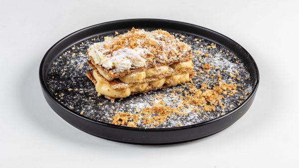 Αυτό είναι το μιλφέιγ με τους πιο φανατικούς οπαδούς στην πόλη. Τα φύλλα του που φτιάχνονται στο χέρι είναι απίστευτα τραγανά και ανάλαφρα ενώ η κρέμα του, γλυκιά όσο πρέπει και διακριτικά αρωματική, λιώνει στο στόμα. Πέρα από την ποιότητα και τη γεύση το στοιχείο που κάνει τη διαφορά στην προκειμένη περίπτωση είναι η προσθήκη αμυγδάλου.