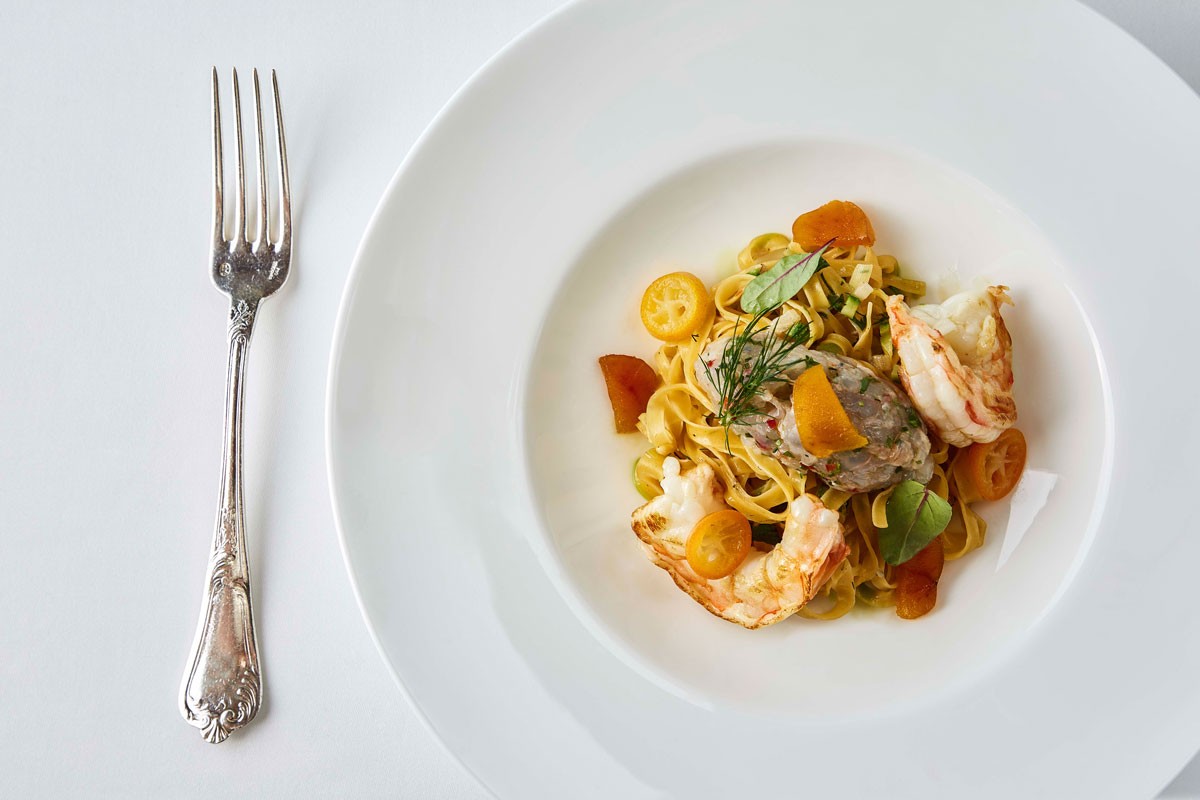 Στο μενού φιγουράρουν πιάτα όπως σούπα κολοκύθα-κάστανο αρωματισμένη με σπόρους κακάο τρούφα και τορτέλι γεμιστό με γαρίδα (€22), καρπάτσιο γαρίδας που μαρινάρουν με χαμομήλι και λεμόνι, γύρη, τσιπς λαχανικών και σαμπαγιόν γαρίδας (€25), γαρίδα tempura με σαλάτα παντζάρι, ζεστή μαγιονέζα με μανταρίνι και «pesto» από σταμναγκάθι και φέτα (€28), γαρίδες στη σχάρα με σιγομαγειρεμένες αγκινάρες, φρικασέ με μανιτάρια, κάστανα, χόρτα και μυρωδικά (€38) κ.ά.