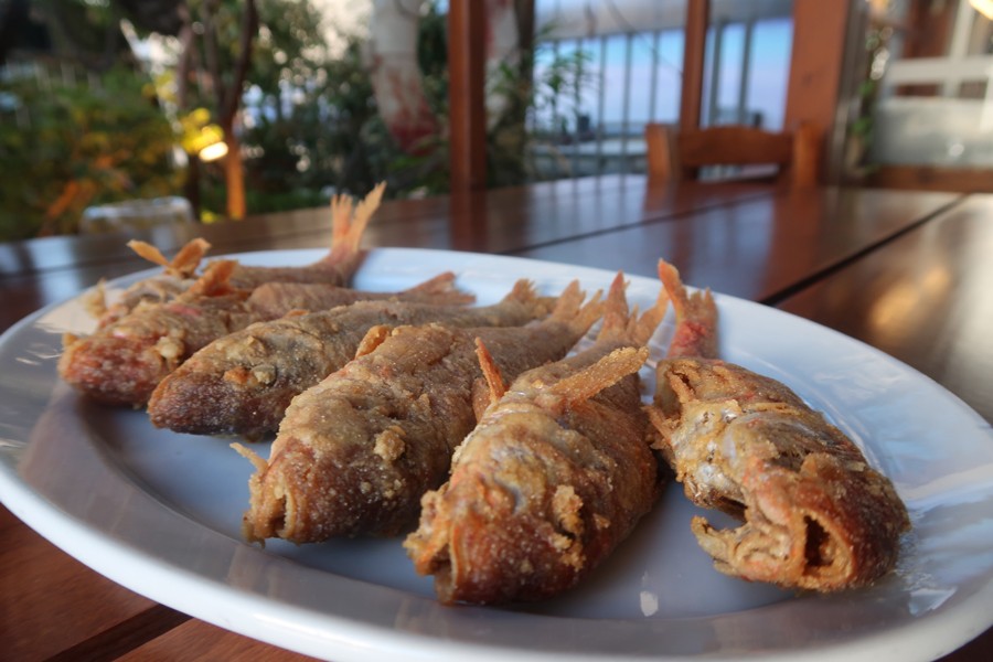 Για κύριο επιλέξαμε μπαρμπούνια – τα είδαμε να μας προκαλούν εκτεθειμένα στον πάγο τους και δεν αντισταθήκαμε. Δικαιωθήκαμε, ήταν φρεσκότατα και ωραία ψημένα. Αποφύγαμε το τηγάνι λόγω προχωρημένης βραδινής ώρας, το αφήσαμε για μεσημβρινή επίσκεψη.