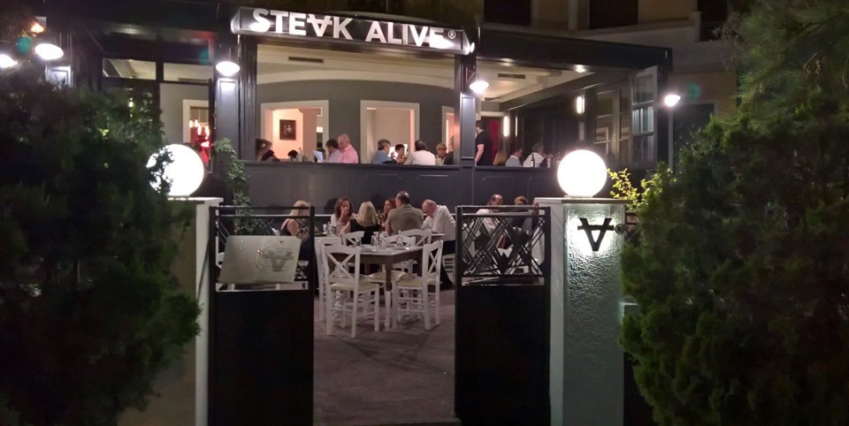 Είχα πρωτοακούσει για το Steak Alive από τον φίλο μου Νίκο Παλαιολόγο, ο οποίος έκανε τον αρχικό σχεδιασμό του (SAINT OF ATHENS) και πρόκειται για ένα πραγματικά όμορφο εστιατόριο, που στεγάζεται στη μονοκατοικία του πρώην δήμαρχου του Κορυδαλλού Γεράκη. Το προπολεμικό αρχοντικό, από τα λίγα εναπομείναντα στην περιοχή, στέκεται επιβλητικό στη γωνία Κρήτης και Αγίου Γεωργίου και αποτελεί αρχιτεκτονικό δείγμα του art deco κινήματος στην Αττική. Ψηλοτάβανο, με όμορφες καμπύλες, ασπρόμαυρα πλακάκια στο δάπεδο, βεράντα και αυλή, το Steak Alive είναι καλοκαιρινός προορισμός για καλό και ποιοτικό φαγητό, όχι μόνο για τους ντόπιους αλλά και για όσους ζουν πιο μακριά. Κατεβαίνοντας από Πεύκη, μέσω Κηφισού, έκανα μόλις μισή ώρα, χωρίς κίνηση. Αρκεί να στρίψει κανείς στην Πέτρου Ράλλη (αμέσως μετά το ΙΚΕΑ) και μετά το GPS σε οδηγεί μέσω της Γρηγορίου Λαμπράκη. Και επειδή γίνονται έργα στην περιοχή ο τρόπος που σας προτείνω είναι ο πιο σίγουρος και ο πιο σύντομος.
