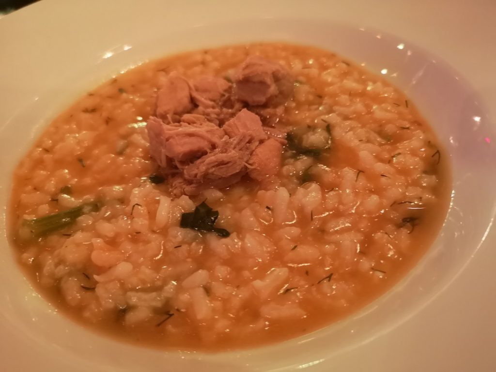 Σαλάτα με λάχανο, καρότο, σέλινο, μαρούλι, άνηθο, τριμμένη ντομάτα και σπασμένο ντάκο από χαρούπι, για κυρίως Λεμονάτο χοιρινό, αρωματισμένο με μάραθο και γραβιέρα συνοδεία ριζότου με σπανάκι ντομάτα και αρωματικά και τέλος Σοκολατόπιτα με σιρόπι σοκολάτας και τριμμένο καρύδι. Αν πάτε ωστόσο για ποτό, μπορείτε να το συνοδεύσετε με ένα πλατό τυριών ή με κάτι άλλο από τον κατάλογο. Θα βρείτε αρκετές επιλογές.