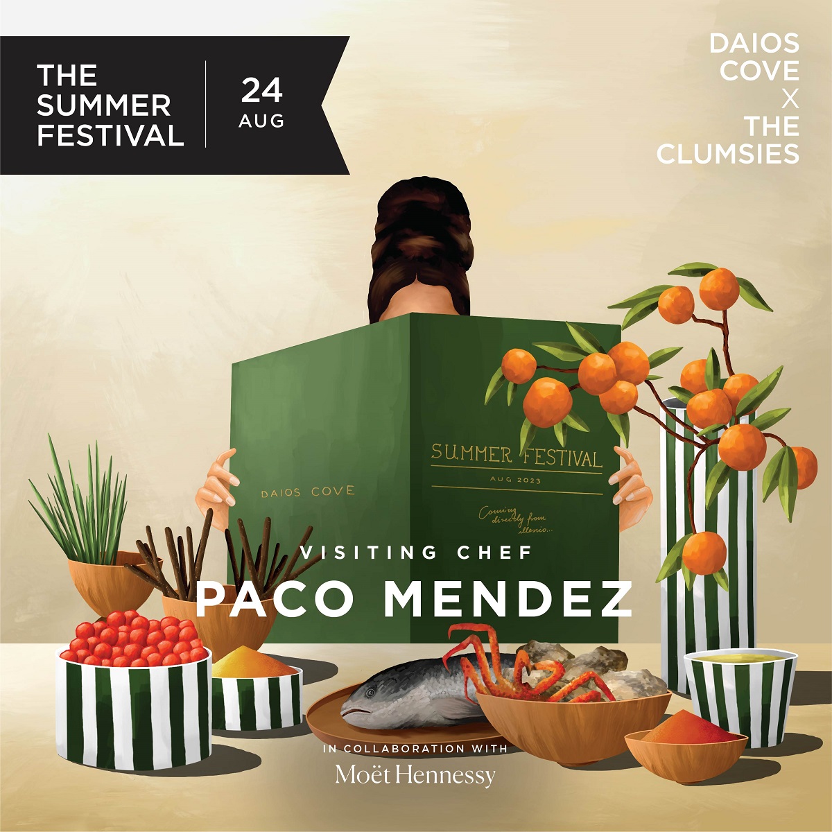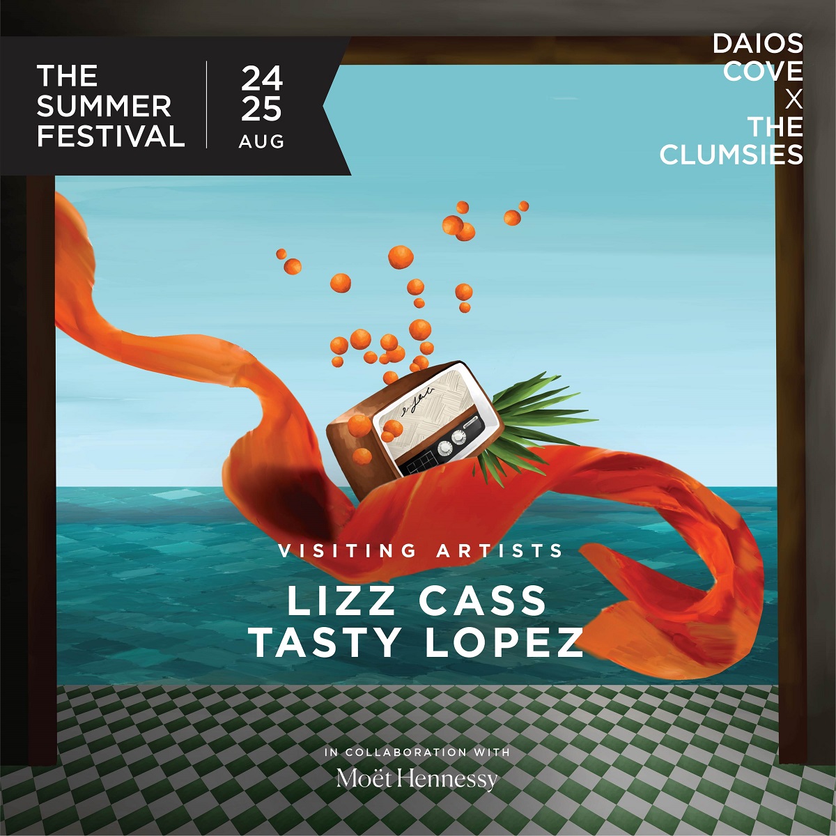 Τη μουσική ατμόσφαιρα αναλαμβάνουν οι ζωντανές εμφανίσεις της pop singer και DJ Liz Cass όπως και η μουσικός και DJ Tasty Lopez, που θα επισκεφθούν το «The Summer Festival Daios Cove x The Clumsies in collaboration with Moët Hennessy» από τον Λονδίνο.