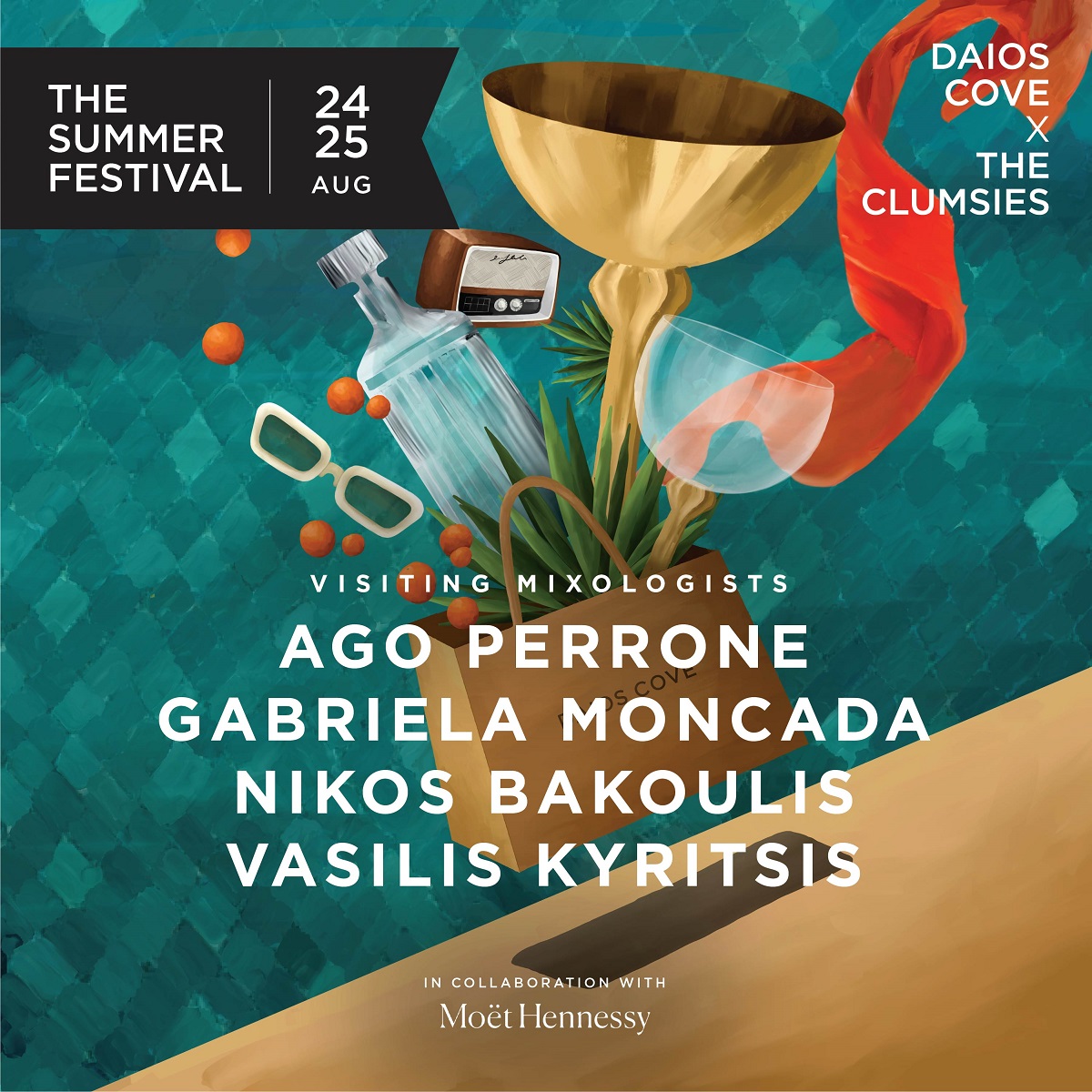 Μια σειρά από συναρπαστικά events διοργανώνει για 3η συνεχόμενη χρονιά στην Κρήτη το «The Summer Festival Daios Cove x The Clumsies in collaboration with Moët Hennessy» στις 24 και 25 Αυγούστου. Σε τέσσερεις υπέροχους χώρους του Daios Cove – το εστιατόριο Ocean Restaurant, το Ocean Bar, τη σχολή μαγειρικής Culinary School και το πρόσφατα ανακαινισμένο Crystal Box – οι φιλοξενούμενοι και οι επισκέπτες θα ταξιδέψουν στην τέχνη του mixology, της γαστρονομίας και της μουσικής.
