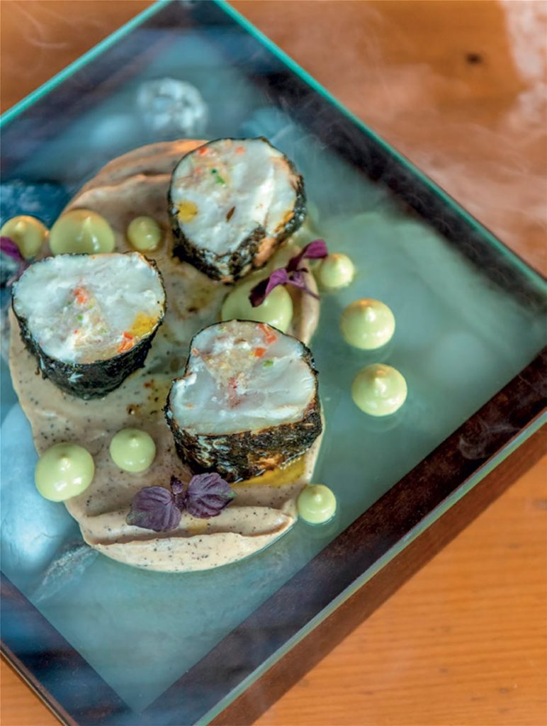 Ψάρι φρικασέ με άγρια χόρτα Τήνου και μπαλοτίνα σφυρίδας με φάρσα λαχανικών τυλιγμένη σε nori, πουρέ από σελινόριζα αρωματισμένη με εσπρέσο και κρέμα αβοκάντο, jalapenos. Δεν παραλείπουμε να κλείσουμε το γεύμα με γλυκό, όπως μία αρωματική τάρτα λεμονιού με χειροποίητο παγωτό από αγελαδινό γάλα.