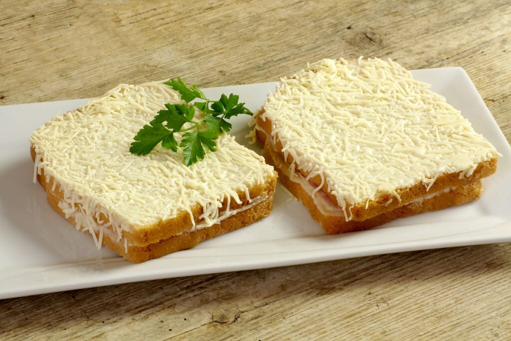 Η έμπνευση για την κλασική γαλλική συνταγή γεννήθηκε σε ένα παρισινό καφέ, το 1910. Το Bel Age, στη Boulevard des Capucines σκέφτηκε για πρώτη φορά να φτιάξει ψωμί, γαρνιρισμένο με ζαμπόν και να τρίψει από πάνω τυρί. Ο ιστορικός René Girard διηγείται το εξής περιστατικό: μια μέρα ένας πελάτης του καφέ ρώτησε τον ιδιοκτήτη από τι κρέας παράγεται ένα σάντουιτς σε σκέτη φέτα ψωμί και εκείνος απάντησε χαριτολογόντας «από το κρέας του κυρίου (monsieur στα γαλλικά)». Και κάπως έτσι γεννήθηκε το όνομα του συγκεκριμένου σνακ.