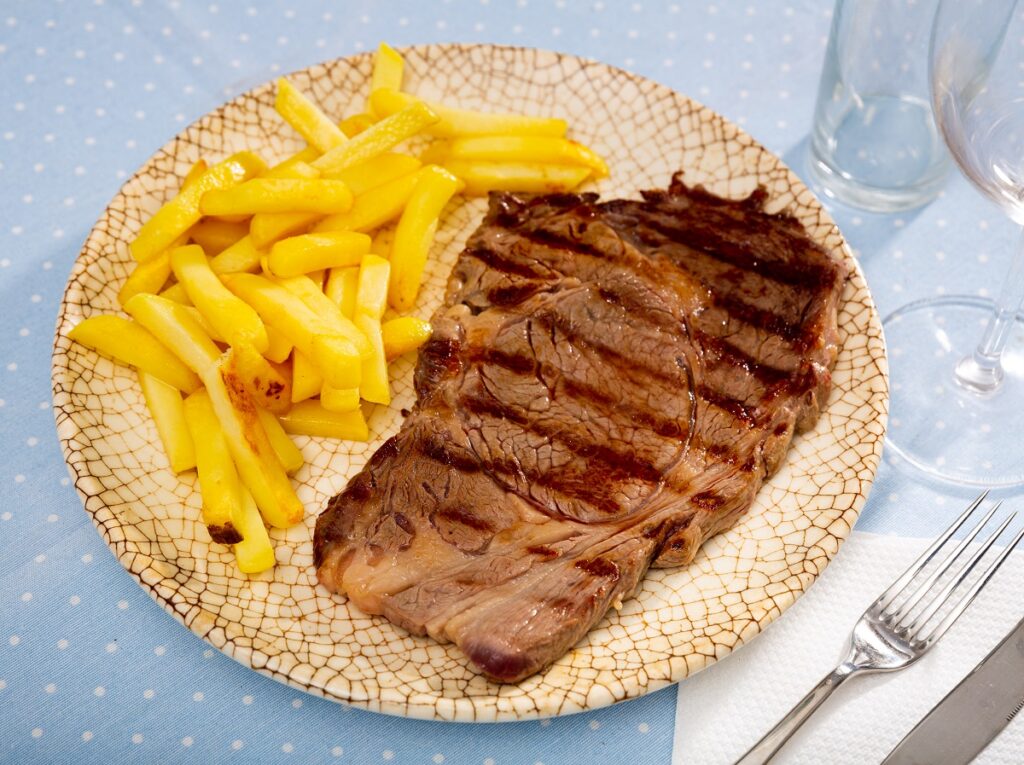 Ταξιδεύουμε στον χρόνο, στον 19ο αιώνα, στην περιοχή της Villette, όπου στεγάζονταν τότε σφαγεία. Στα διαλείμματά τους οι κρεοπώλεις απολάμβαναν τις φρέσκες μοσχαρίσιες μπριζόλες μαγειρεμένες με πολλά μυρωδικά, που τις συνόδευαν με πατάτες «Pont Neuf». Οι πρόγονοι της τηγανητής πατάτας λέγεται ότι γεννήθηκαν στο Παρίσι και όχι στο Βέλγιο και συγκεκριμένα στο γεφυράκι του Σηκουάνα Pont Neuf, όπου οι πλανόδιες πωλήτριες τις προωθούσαν στους περαστικούς. Πλέον το συγκεκριμένο πιάτο είναι κλασικό σε μια γαλλική brasserie, στο Παρίσι ή αλλού.