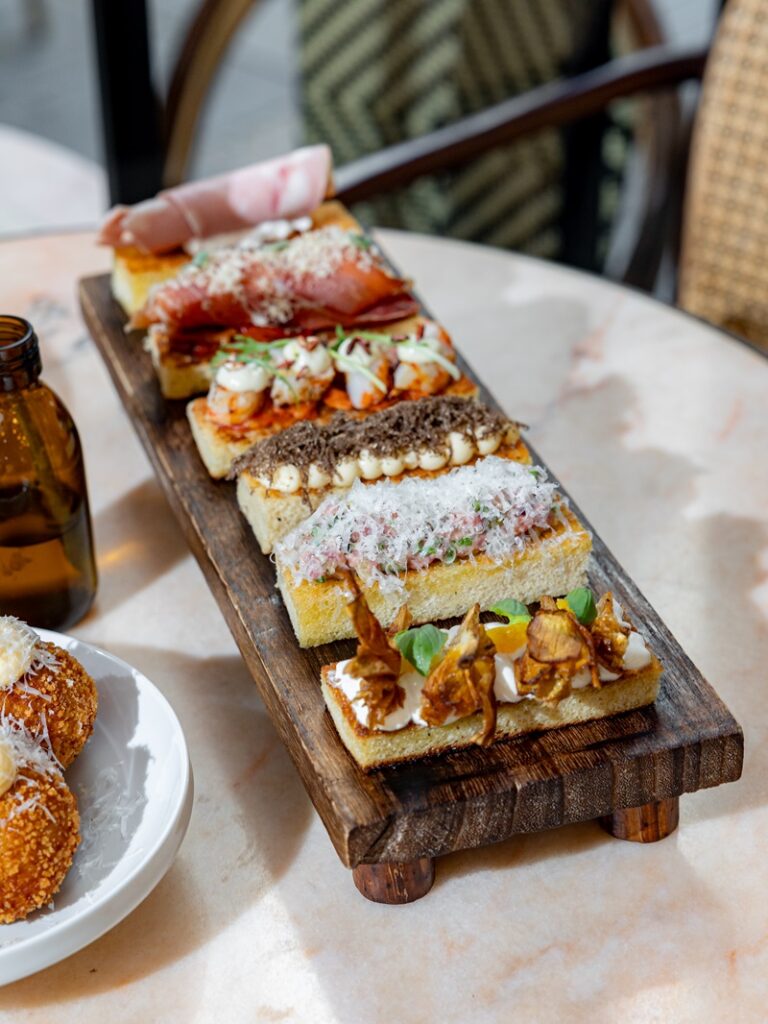 Το επισκέφτηκα μια Τρίτη απόγευμα-βράδυ που ο καιρός το επέτρεπε να καθίσω έξω. Έχοντας τον κατάλογο στα χέρια μου, χάζευα λίγο τα γύρω τραπέζια. Σχεδόν σε όλα υπήρχαν αυτά τα cicchetti και ένα ποτήρι κρασί ή ένα κοκτέιλ. Λογικό ήταν λοιπόν, να κάνω και εγώ το ίδιο. Για αρχή είπα να δοκιμάσω «ένα από όλα» που λένε. Έξι είναι στο σύνολό τους ενώ για βάση έχουν ένα βουτυράτο ψωμί το οποίο φρυγανίζουν ελαφρώς ώστε να είναι τραγανό εξωτερικά και μαλακό εσωτερικά. Από αυτά τα έξι διαφορετικά cicchetti ξεχώρισα εκείνο με το μοσχαρίσιο ταρτάρ και το μπόλικο τριμμένο τυρί manchego, εκείνο με την ελαφριά τηγανισμένη αγκινάρα (να και θα ήθελα να ήταν περισσότερη σε ποσότητα), το πρόβeιο γιαούρτι και τον φρέσκο βασιλικό καθώς επίσης και εκείνο με την ημίπαστη γαρίδα, τον ταραμά και το λιγοστό chorizo που του έδινε ένα πιο πικάντικο τόνο.
