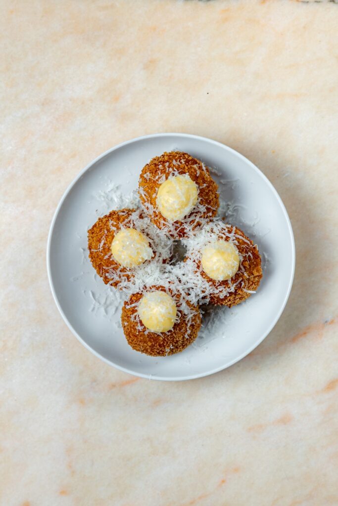 Φυσικά δεν έμεινα μόνο στα παραπάνω, δοκίμασα και τις κροκέτες που ο Καρακατσάνης φτιάχνει με sobrasada (πάστα που φτιάχνεται από χοιρινό κρέας και πάπρικα) και τις στολίζει με μπόλικο τυρί manchego. Ήταν ωραία τραγανές και ευχάριστες αλλά ήθελαν λίγο περισσότερη sobrasada για να ισορροπήσει η γλυκά από την μπεσαμέλ. Επίσης δοκίμασα το τηγανητό κοτόπουλο που σερβίρεται πάνω σε μια γευστική coleslaw φινόκου. Τόσο το πανάρισμα όσο και το τηγάνισμα του κοτόπουλου ήταν υποδειγματικό: φοβερά τραγανό, χωρίς ίχνος λαδιού να μένει στο χέρι και επίσης άκρως ζουμερό. Σίγουρα είναι από τα πιάτα που θα ζητούσα ξανά.