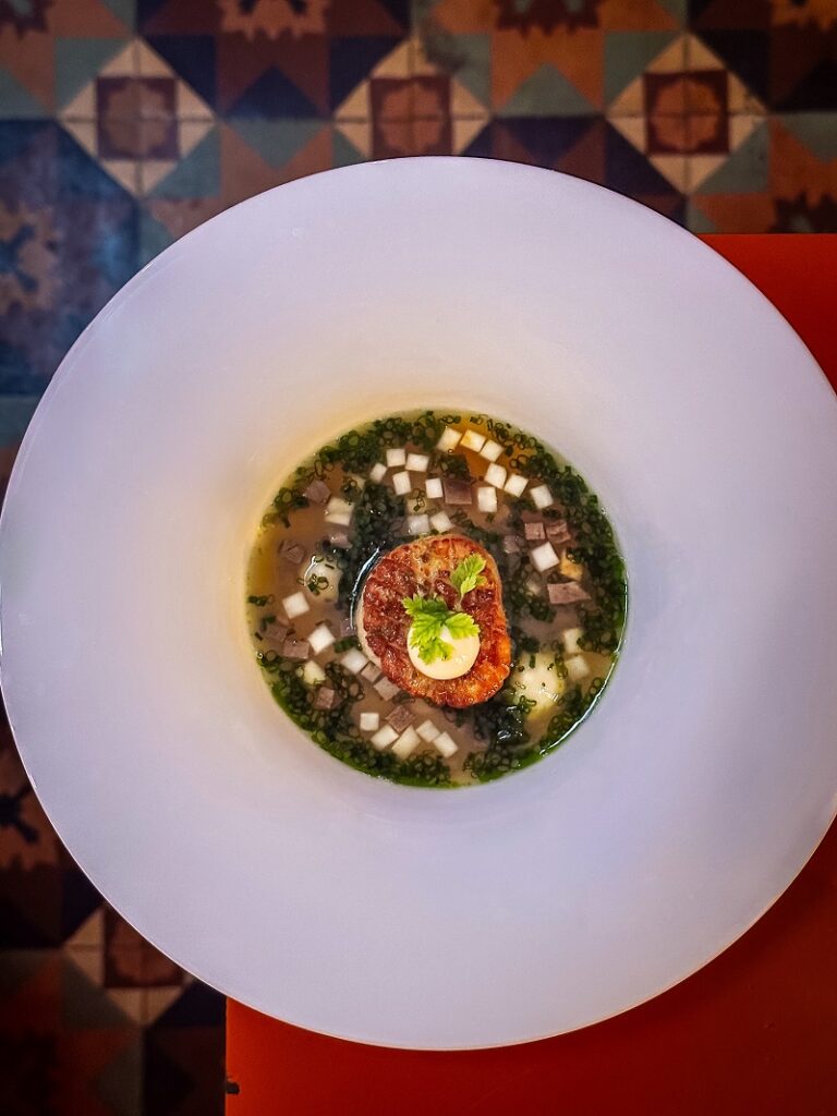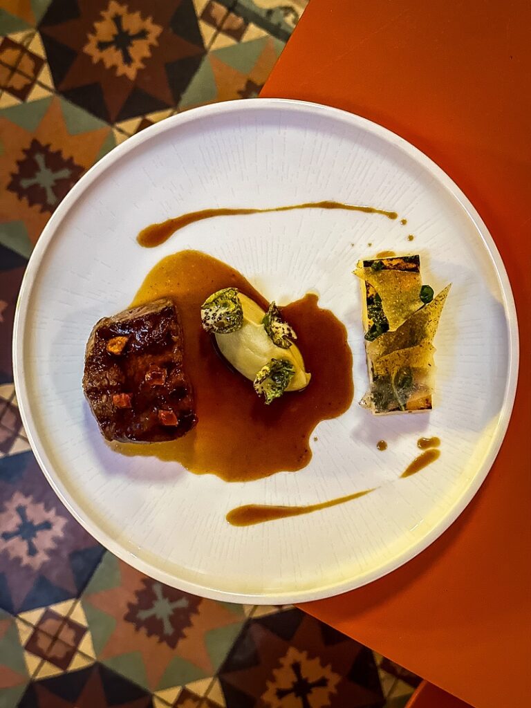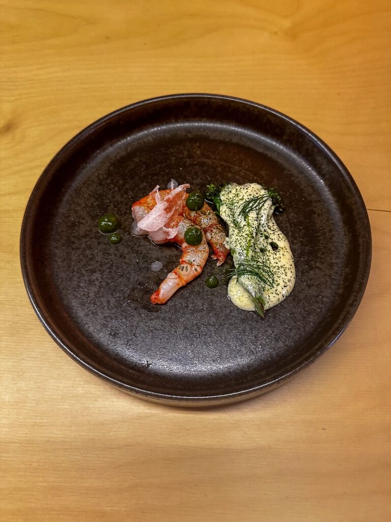 Η γευστική διαδρομή του μενού γευσιγνωσίας ξεκινά με το καλωσόρισμα του σεφ, μια τραγανή κροκέτα αρνιού, ακουμπισμένη πάνω σε ketchup χέλι και καρέ κόκκινης πιπεριάς. Την σκυτάλη παίρνει ένα αφράτο milkbread που φτάνει αχνιστό και καλυμμένο με γλάσο από σάλτσα στιφάδο. Ιδιαίτερο πιάτο, τόσο για τη λεπτότητα στη γεύση όσο και για τον έντεχνο συνδυασμό των υλικών του, είναι η ελαφρώς καψαλισμένη γαρίδα, με coppa di Parma, μπροκολίνι και πλούσια καρμπονάρα sauce. Ξεχωρίζουν, ακόμη, για τα ψησίματα και τα ωραία αρώματά τους, το χτένι με λαδοτύρι και σελινόριζα μέσα σε κονσομέ μοσχαρίσιας γλώσσας καθώς και το μυλοκόπι με αγκινάρες, καρότα, πατάτες και σάλτσα λεμόνι.