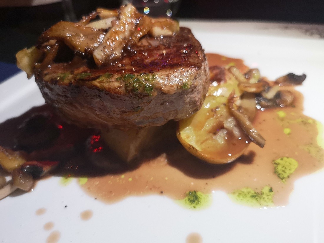 Για κυρίως επιλέξαμε το τρυφερό Φιλέτο μόσχου γάλακτος με σάλτσα κόκκινου κρασιού, πουρέ μανιταριών, μανιτάρια σωτέ και baby πατάτες και το Φιλέτο σολομού σχάρας, που σερβίρεται με κροκέτες πατάτας, σάλτσα αγριοράπανου και μαγιονέζα λεμονιού. Και τα δύο ήταν πολύ νόστιμα πιάτα, τα οποία συνοδεύσαμε με ένα ωραίο μπουκάλι ροζέ κρασί. Στον κατάλογο υπήρχαν και άλλες ενδιαφέρουσες επιλογές, όπως οι Ταλιατέλες με σιγανομαγειρεμένο μοσχαράκι ραγού σε κρασί Μαρσάλα με φρέσκια ντομάτα σε κρέμα ωριμασμένης παρμεζάνας, ενώ αν δεν σας αρέσει κάποια γαρνιτούρα σάς δίνετε η επιλογή να την αλλάξετε και να προσθέσετε, για παράδειγμα, ψητά λαχανικά. Το προσωπικό ήταν ευγενέστατο και πλήρως ενημερωμένο, ενώ θα σας κατευθύνει πολύ εύστοχα, ώστε να παραγγείλετε αυτό ακριβώς που θέλετε. Ωστόσο, στο τέλος, αν έχετε χώρο, μην πείτε όχι στο Σουφλέ σοκολάτας με σαντιγί βανίλιας, παγωτό κρέμα και σάλτσα σοκολάτας!