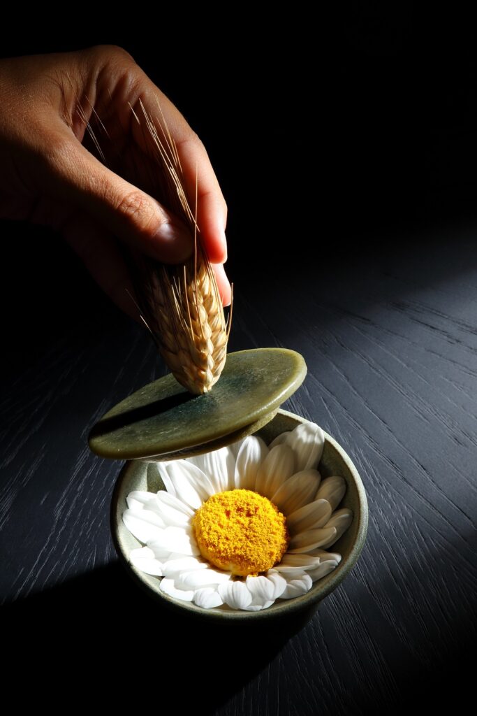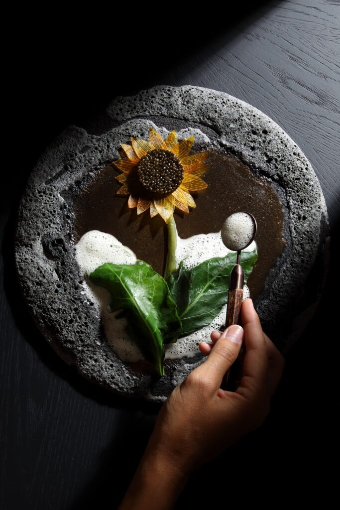 Με αυτή τη λογική χτίζεται το μενού, με ελληνικές και πραγματικά ψαγμένες και καλοδουλεμένες πρώτες ύλες. Με άψογα εκτελεσμένες τεχνικές και υψηλή αισθητική. Αν έχω μια ένσταση, αυτή βρίσκεται στο γεγονός ότι με κανένα από τα πιάτα δεν κατάφερα να συνδεθώ συναισθηματικά, κανένα δεν μου ξύπνησε κάποια μνήμη συγκεκριμένου ελληνικού φαγητού, αν και οφείλω να ομολογήσω ότι και καμία γεύση δεν στάθηκε ως ξένη στο σύνολό της. Μια παπαρούνα κάνει την εμφάνισή της στο πιάτο, ένας ηλίανθος ανθίζει βρίσκοντας νέα «γη» και κρύβοντας τη θάλασσα κάτω από το πράσινο των φύλλων του.