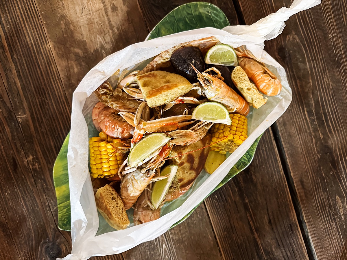 Το… showstopper της βραδιάς ήταν σίγουρα το crayfish bucket, κατάλληλο για τη μέση, σε τραπέζια με μεγάλες παρέες. Γαρίδες, καραβίδες, καλαμπόκι, πιτάκια και πολύχρωμες πατάτες αναμειγνύονται με ελαφρώς spicy μπαχαρικά cajun και έρχονται μέσα σε αντικολλητικό χαρτί πάνω σε μια μεγάλη γόνδολα.