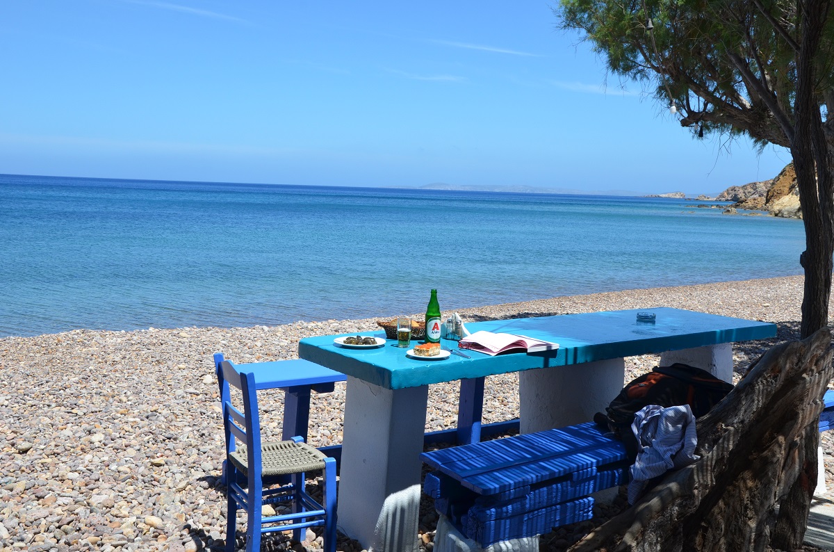 Ιστορία: Βρίσκεται στην ομώνυμη γραφική παραλία του νησιού και τα μπλε τραπεζοκαθίσματά της απλώνονται πάνω στο ψιλό βότσαλο. Πρωτολειτούργησε ως καφενείο στα τέλη της δεκαετίας του 1950 και τα πρώτα χρόνια ο κόσμος ερχόταν με καΐκια ή με τα πόδια.