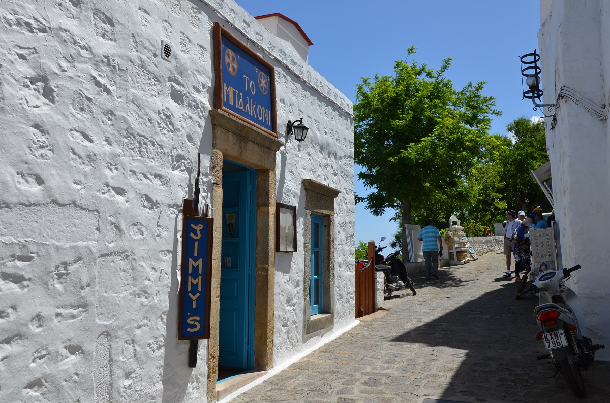 Ιστορία: Κάτω από τη σκιά του επιβλητικού Καστρομονάστηρου του Αγ. Ιωάννη του Θεολόγου, σε ένα κτίριο του 1795, βρίσκεται η εν λόγω ταβέρνα. Το πιο όμορφο μπαλκόνι του νησιού με μοναδική θέα, απ’ όπου όταν ο ορίζοντας είναι καθαρός φαίνονται η Ικαρία και η Σάμος. Ιδιοκτήτης ο Δημήτρης Καλαϊτζής, γνωστός και ως Jimmy που γύρισε από την Αμερική όταν κληρονόμησε το οίκημα.
