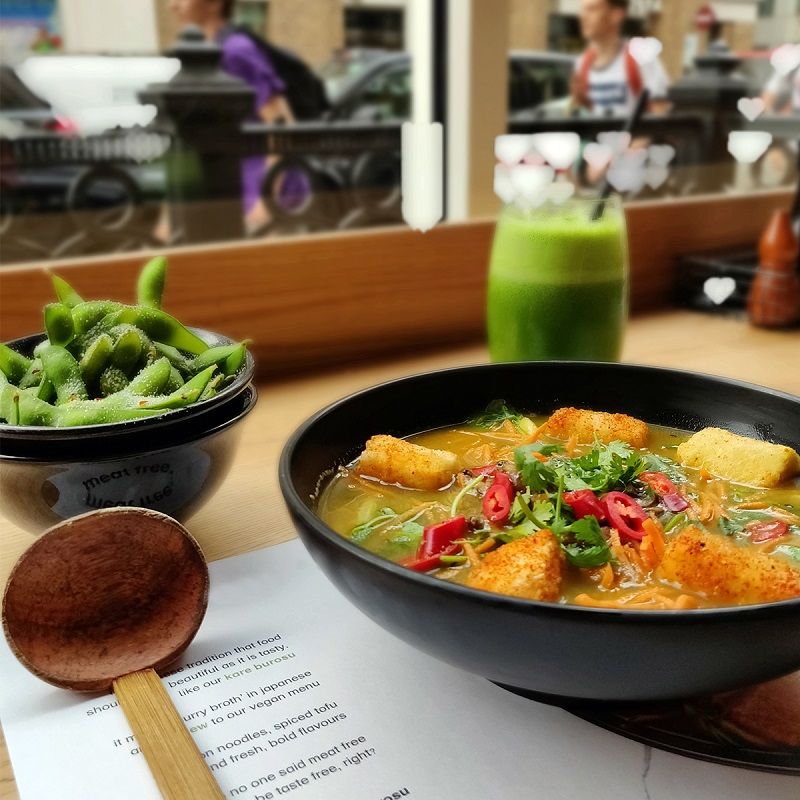 Επιλέξαμε λοιπόν, yasai itame που είναι noodles ρυζιού με τόφου σε ελαφρώς πικάντικη σάλτσα curry με καρύδα, λεμονόχορτο, φρέσκα κρεμμυδάκια, bock choi, πιπεριές, μανιτάρια, ρίζες φασολιών σόγιας και τσίλι, γαρνιρισμένα με κόλιανδρο και lime που συμπληρώνουν ιδανικά τη γεύση τους. Και αν αυτό το πιάτο ήταν ελαφρώς πικάντικο, δεν μπορούμε να πούμε το ίδιο για το kare burosu ramen, ένα ramen omakase με τόφου πασπαλισμένο με μίγμα 7 μπαχαρικών, ανάμεικτα μανιτάρια, udon noodles και πικάντικο ζωμό λαχανικών, που γαρνίρεται με baby σπανάκι, καρότο, chilies και κόλιανδρο. Ένα πιάτο με πραγματικά πλούσια γεύση, που σίγουρα θα αγαπήσουν όσοι προτιμούν τις πικάντικες και δυνατές γεύσεις. Η vegan της παρέας μας πάντως, το ψήφισε ως το αγαπημένο της.