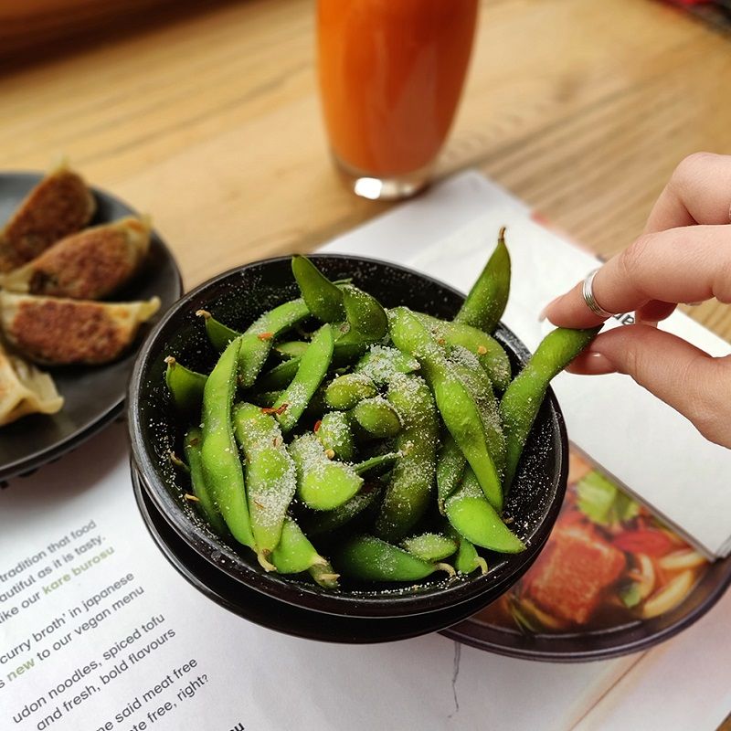 Στην τελευταία μας επίσκεψη στο εστιατόριο της Κηφισιάς, ένα βράδυ Πέμπτης μετά το γραφείο, συναντήσαμε μία ευχάριστη έκπληξη στο μενού, διαπιστώνοντας ότι έχουν προστεθεί νέα vegan πιάτα. Αντί λοιπόν για τις συνηθισμένες μας επιλογές σε sushi και curry με κοτόπουλο, βάλαμε στο τραπέζι μας τόφου. Μοναδική και αδιαπραγμάτευτη σταθερά μας, τα edamame στην αρχή, τα οποία μας κάνουν την καλύτερη παρέα όσο περιμένουμε να ετοιμαστεί το φαγητό μας.
