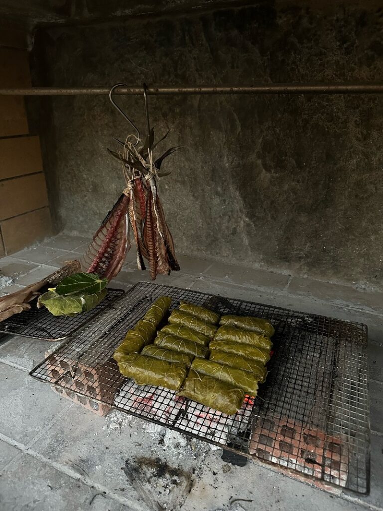 • Ντολμάδες στη σχάρα (γεμιστά αμπελόφυλλα) με το κεφάλι και τα μάγουλα του ψαριού, κάπαρη, ψητά νεκταρίνια, κατσικίσιο βούτυρο στάκα και άνθη σκόρδου