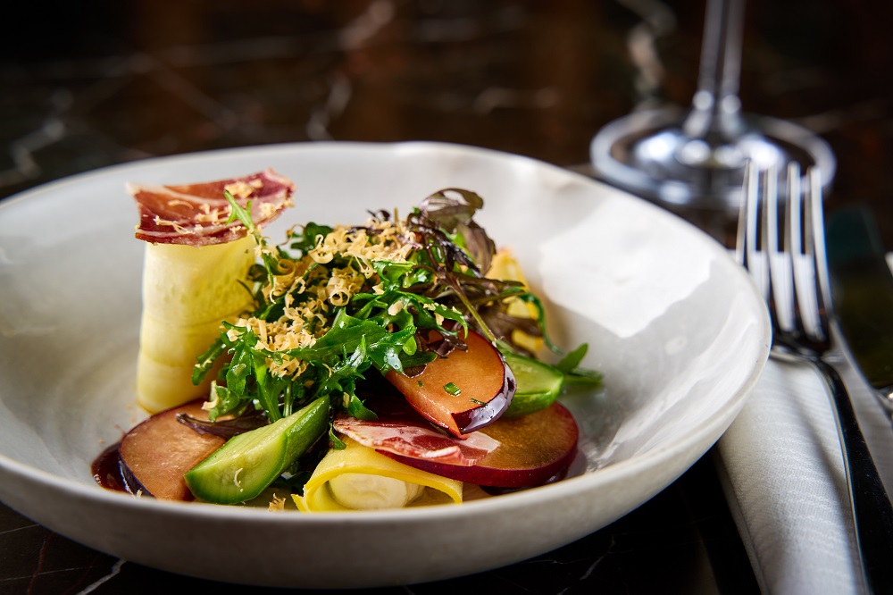 Ακολούθησε μια καλοζυγισμένη σαλάτα με ρόκα, δυόσμο, λούζα, ρολάκια από λεπτοκομμένο κίτρινο κολοκύθι, φιστίκια Αιγίνης και παλαιωμένη μυζήθρα, όπου βανίλιες, σε λεπτές φετούλες, δημιουργούσαν μια ευχάριστη γλυκόξινη αντίστιξη.