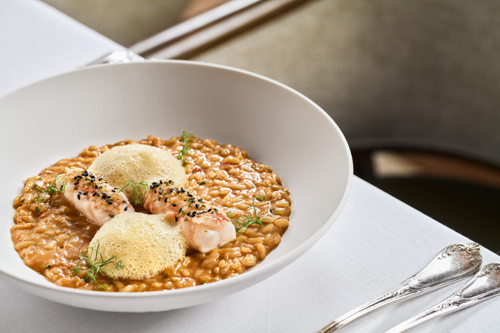 Μεχρι να φτάσουμε στην πάπια και το γλυκό φινάλε είχαν προηγηθεί τα Tagliolini με γάρο αντζούγιας, λεμόνι και ζωμό δεμένο με βούτυρο. Ένα πιάτο τόσο απλό και γευστικό όσο ακούγεται στην περιγραφή του- το ριζότο με άψογα ψημένη, γλυκοφαγωτη καραβίδα και έναν προβοκατόρικο συνδυασμό από αφρό εσπρέσο με κάρυ και furikake, (το Ιαπωνικό άρτυμα με σκόνη αποξηραμένων ψαριών ) αλλά και μία σφυρίδα φρικασέ με μύδια, τραγανή λαχανίδα και αυγολέμονο.