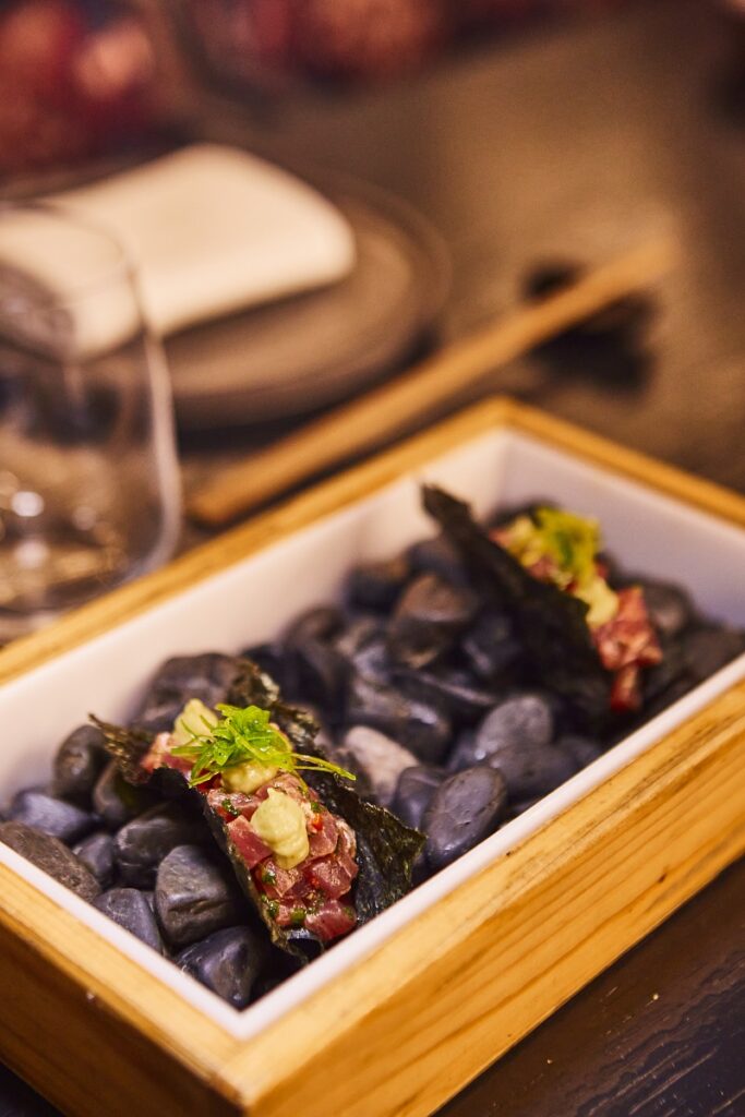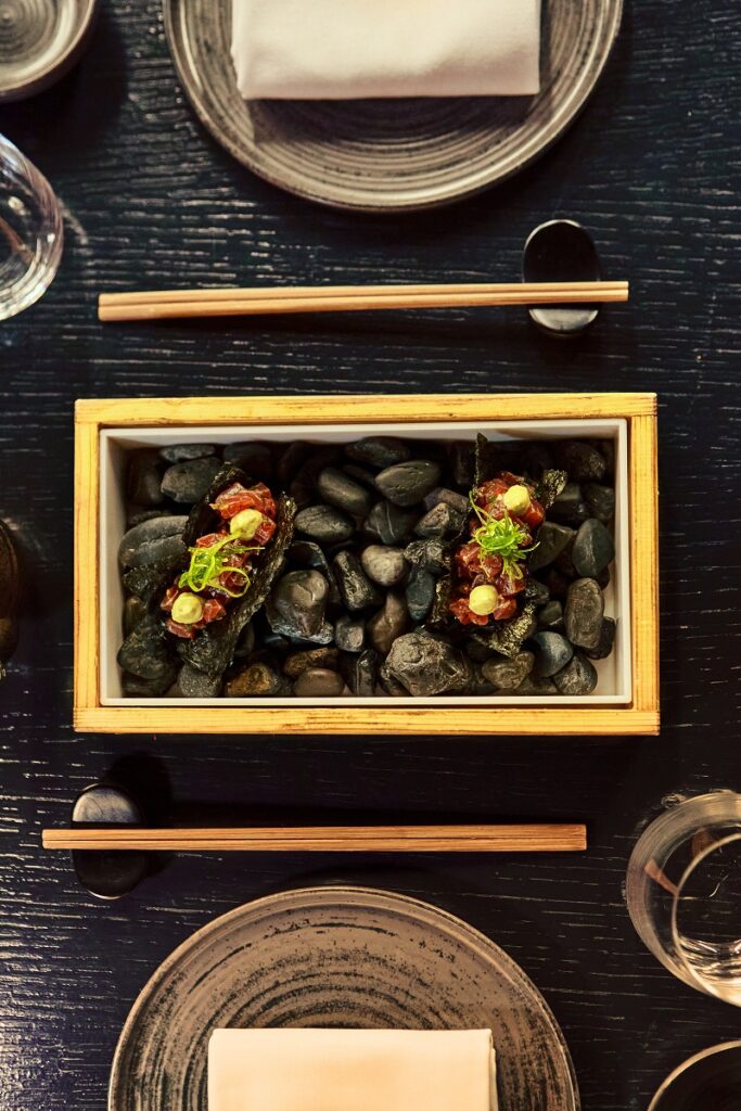 Σε πρώτο πλάνο η ανοιχτή κουζίνα με τους Γρηγόρη Μυρσιάδη, Σωτήρη Λίτσα και την ομάδα τους να εκτελούν με τον καλύτερο δυνατό τρόπο το μενού που επιμελήθηκε ο Δημήτρης Κοντόπουλος. Οι γεύσεις συνδυάζουν με τον πιο ανατρεπτικό και γευστικό τρόπο την ιαπωνική κουζίνα με τις ελληνικές πρώτες ύλες.