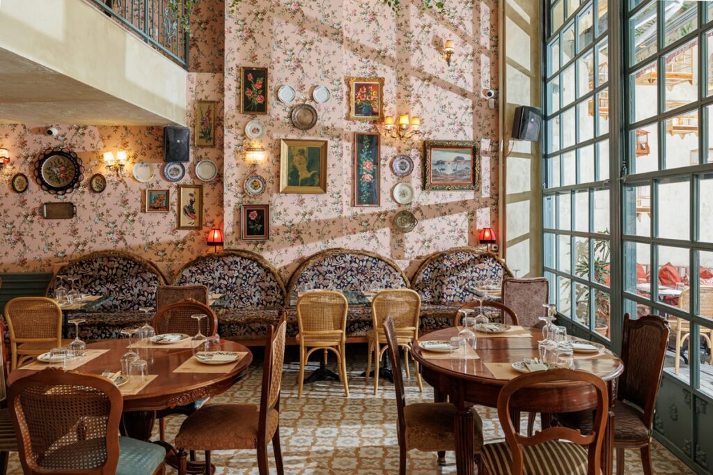 Οι ψηλές σάλες, οι φλοράλ ταπετσαρίες, τα κεντήματα σε κάδρα, τα παλιά συλλεκτικά πιάτα στους τοίχους, όλα μαζί φτιάχνουν ένα εσωτερικό που παραπέμπει σε αστική κατοικία της δεκαετίας του ’70, αλλά χωρίς να γίνεται μουσείο. Ζεστό, ελαφρώς γεμάτο, με τη σωστή δόση θορύβου, αυτή που σημαίνει ότι οι άνθρωποι περνάνε καλά.
