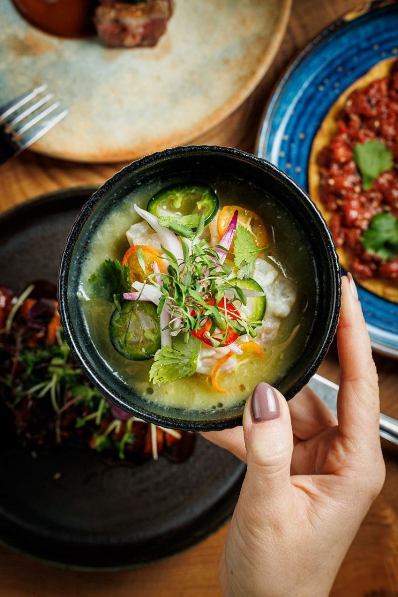 Για να συνοδέυσω το ceviche λαβράκι αλλά και το ταρτάρ τόνου σε νερό τομάτας ζήτησα ένα Gin Gin Mule, πολύ φρέσκο, δροσερό, με έντονη τη γεύση της πιπερόριζας και του δυόσμου. Ήταν ό,τι έπρεπε με το καυτερό και απολαυστικό ceviche (το κουμκουάτ σε αυτό το πιάτο ήταν μια ευχάριστη έκπληξη), ενώ το κάπως άτονο ταρτάρ έκλεβε κάτι από τη φρεσκάδα του κοκτέιλ.
