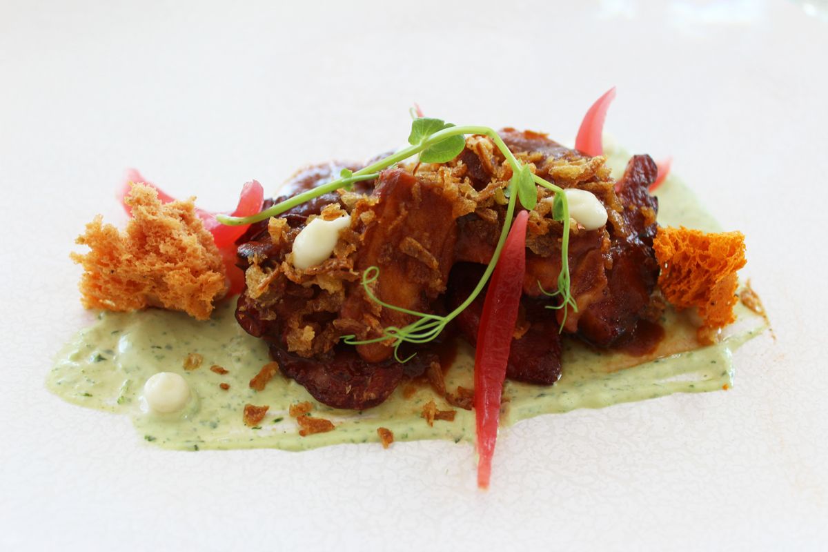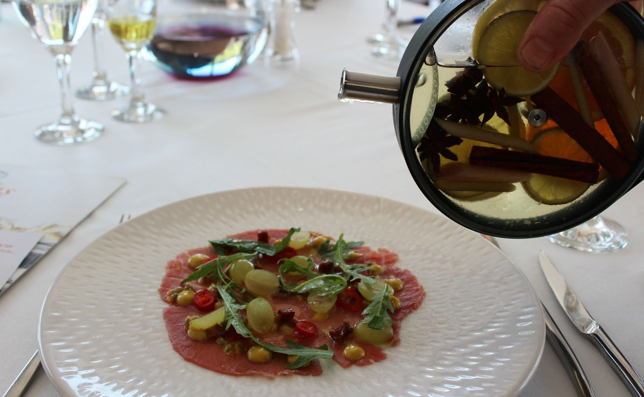 Καρπάτσιο τόνου με σούμα από τα Σιάννα, γαριδάκι λινδιακό σε υφές από παντζάρι, χταπόδι στιφάδο με λουκάνικο Έμπωνας, λαιμός αρνί αργοψημένος στη σάλτσα του με δεντρολίβανο