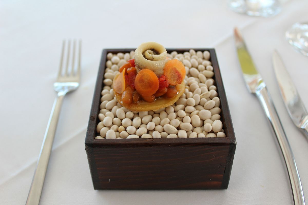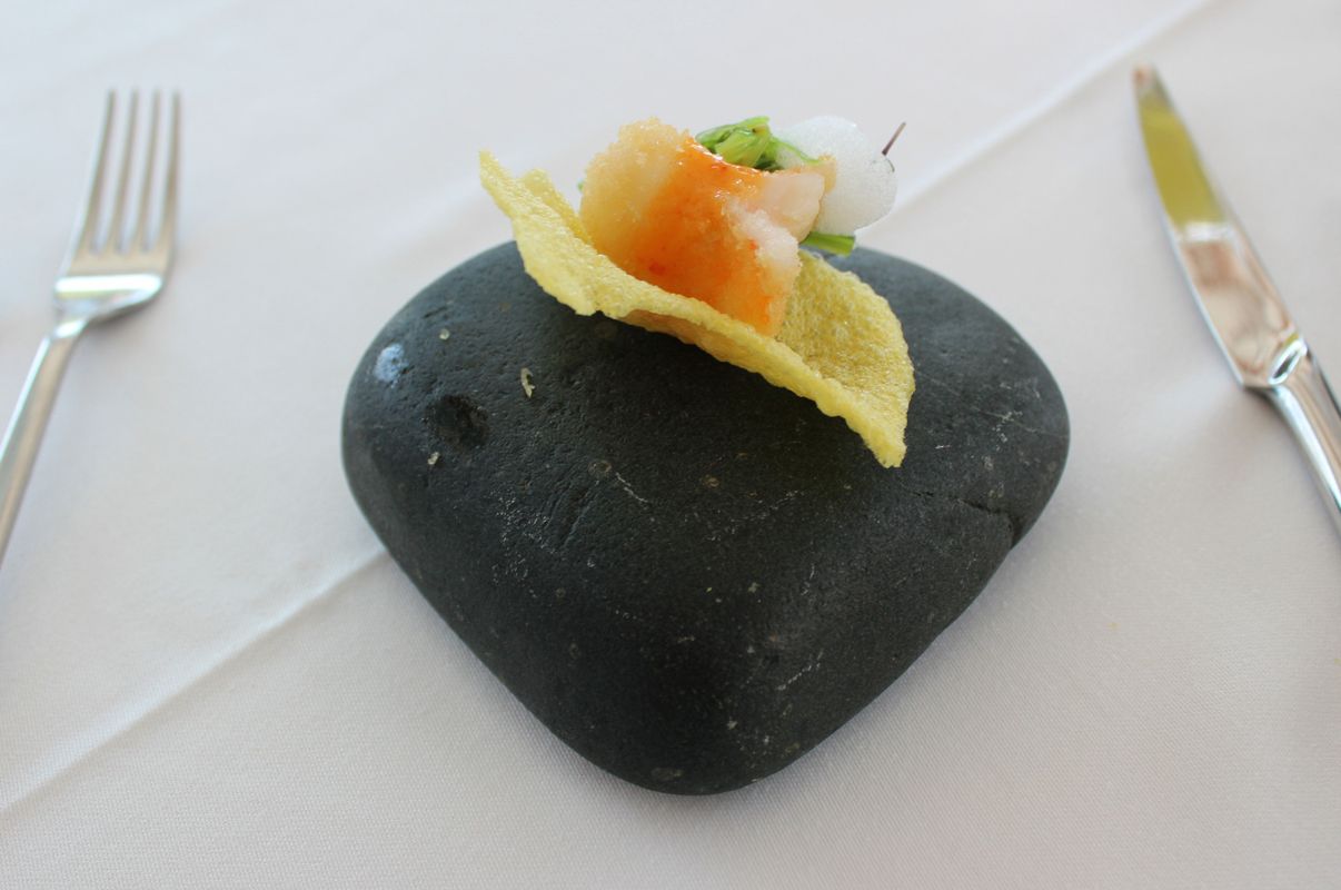 Το μενού γευσιγνωσίας που δοκιμάσαμε συνοδευόταν από αφηγηματικές παύσεις του οικοδεσπότη μας, που φρόντισε να δώσει στους «μουσαφίρηδές» του μια αντιπροσωπευτική εικόνα μιας μαγειρικής φιλοσοφίας που γεφυρώνει αρμονικά την παράδοση με το μοντερνισμό. Εισαγωγή με τρία amuse bouche (ορεκτικά)-αλληγορική μεταφορά στις «καλές ψαριές» του τόπου: ένα τραγανό κράκερ από σαφράν με γαρίδα, φύκια και αφρό λεμονιού και στη συνέχεια μια μπουκιά ροδίτικης λαδόπιτας με λόπια (φασόλια) Κατταβιάς, ημίλιαστη ντομάτα, γαύρο μαρινάτο, πίκλα καρότου και λάδι σέλινου. Πρόκειται για μια δημιουργική μετάφραση του φαγητού των ψαράδων (ψάρια με περικαυτή, ψωμί ζυμωτό δηλαδή που ραντίζεται με λάδι, πασπαλίζεται με ρίγανη και ψήνεται στα κάρβουνα), όπου η περικαυτή αντικαθιστάται με έναν τραγανό δίσκο λαδόπιτας. Ένα κράκερ από ρύζι με μελάνι σουπιάς, σουπιά μαγειρεμένη με συνταγή της γιαγιάς του σεφ, πίκλα από φινόκιο και μάραθο, «σουπιόρυζο» ουσιαστικά σε μια μπουκιά, έκλεισε την τριάδα των amuse προϊδεάζοντάς μας για την ενδιαφέρουσα συνέχεια.