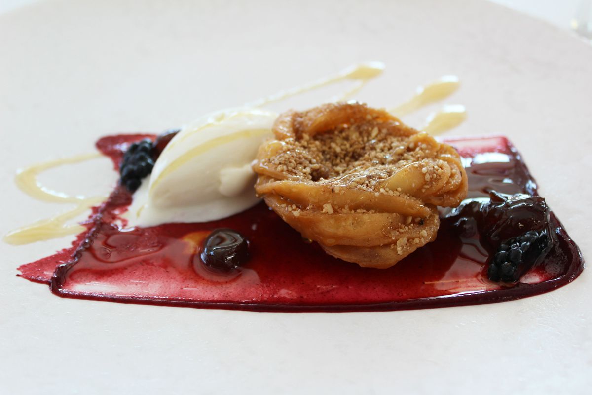 Η γαστρονομική γραφή του σεφ είναι προσεγμένη και στα γλυκά. Το pre-dessert ΜΑ.ΠΟ.ΛΕ (ακρωνύμιο του Μανταρίνι-Πορτοκαλάδα-Λεμόνι), είναι έμπνευση από τη φημισμένη τοπική λεμονάδα της οικογένειας Αγιακάτσικα, από το 1950 (η επιχείρηση έκλεισε το 1992 ωστόσο η συνταγή παρέμεινε επτασφράγιστο μυστικό), με σπιτική λεμονάδα, σορμπέ, μαρμελάδα, γρανίτα και σιφόν (απαλή κρέμα) από λεμόνι, αγγούρι, νότες ελαιολάδου και χοντρό αλάτι. Δροσερό και ισορροπημένο, με σύλληψη και εκτέλεση που συμπληρώνει την «ξενάγηση» του επισκέπτη στη μαγειρική κουλτούρα του τόπου. Στο ίδιο μοτίβο και τα δύο επιδόρπια που ακολούθησαν, οι μαντινάδες-τοπικό γλυκό που προσφέρουν στους κουμπάρους στους γάμους-που ο σεφ σερβίρει με παγωτό γιαούρτι, γλυκό σταφύλι, κρέμα κόκκινων φρούτων και πευκόμελο και το «σουρμπέτι με μελεκούνι». Το σουρμπέτι είναι ένας τύπος κανελάδας με μια φυτική χρωστική, το κριμίτζι που προσφέρουν στα «κρεβάτια» των γάμων και το μελεκούνι είναι ένα μαλακό παστέλι που προσφέρουν στους γάμους. Ο σεφ «πάντρεψε» αυτά τα δυο σε μια μπουκιά σφαίρας σοκολάτας.