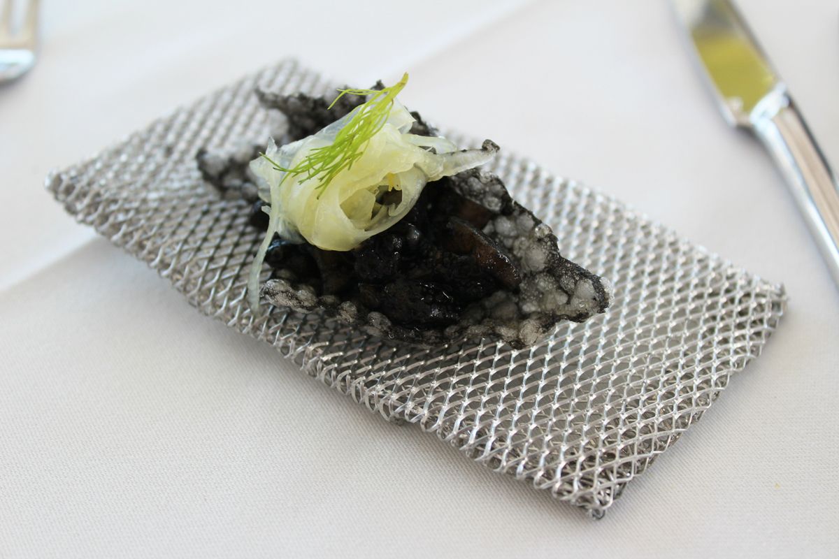 Το μενού γευσιγνωσίας που δοκιμάσαμε συνοδευόταν από αφηγηματικές παύσεις του οικοδεσπότη μας, που φρόντισε να δώσει στους «μουσαφίρηδές» του μια αντιπροσωπευτική εικόνα μιας μαγειρικής φιλοσοφίας που γεφυρώνει αρμονικά την παράδοση με το μοντερνισμό. Εισαγωγή με τρία amuse bouche (ορεκτικά)-αλληγορική μεταφορά στις «καλές ψαριές» του τόπου: ένα τραγανό κράκερ από σαφράν με γαρίδα, φύκια και αφρό λεμονιού και στη συνέχεια μια μπουκιά ροδίτικης λαδόπιτας με λόπια (φασόλια) Κατταβιάς, ημίλιαστη ντομάτα, γαύρο μαρινάτο, πίκλα καρότου και λάδι σέλινου. Πρόκειται για μια δημιουργική μετάφραση του φαγητού των ψαράδων (ψάρια με περικαυτή, ψωμί ζυμωτό δηλαδή που ραντίζεται με λάδι, πασπαλίζεται με ρίγανη και ψήνεται στα κάρβουνα), όπου η περικαυτή αντικαθιστάται με έναν τραγανό δίσκο λαδόπιτας. Ένα κράκερ από ρύζι με μελάνι σουπιάς, σουπιά μαγειρεμένη με συνταγή της γιαγιάς του σεφ, πίκλα από φινόκιο και μάραθο, «σουπιόρυζο» ουσιαστικά σε μια μπουκιά, έκλεισε την τριάδα των amuse προϊδεάζοντάς μας για την ενδιαφέρουσα συνέχεια.