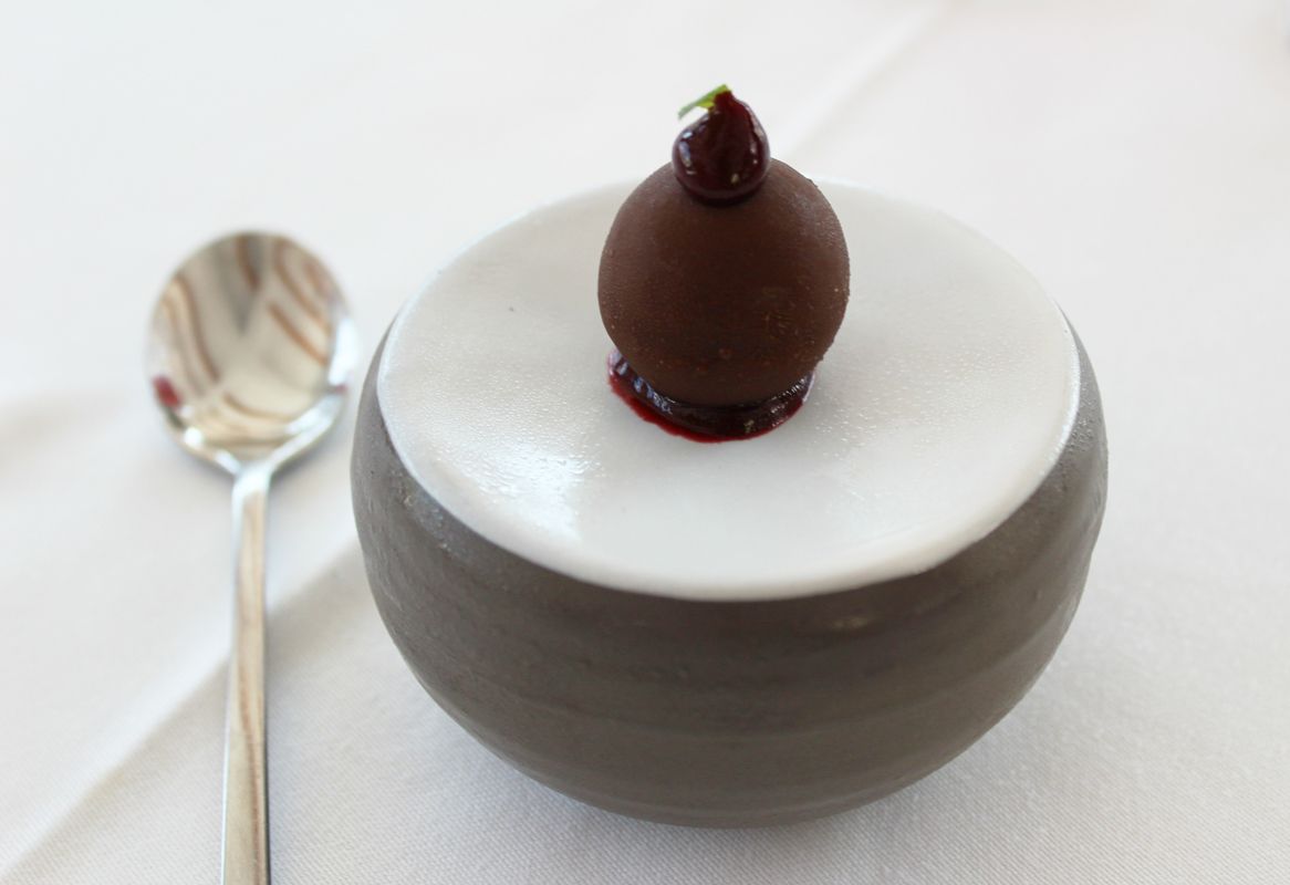 Η γαστρονομική γραφή του σεφ είναι προσεγμένη και στα γλυκά. Το pre-dessert ΜΑ.ΠΟ.ΛΕ (ακρωνύμιο του Μανταρίνι-Πορτοκαλάδα-Λεμόνι), είναι έμπνευση από τη φημισμένη τοπική λεμονάδα της οικογένειας Αγιακάτσικα, από το 1950 (η επιχείρηση έκλεισε το 1992 ωστόσο η συνταγή παρέμεινε επτασφράγιστο μυστικό), με σπιτική λεμονάδα, σορμπέ, μαρμελάδα, γρανίτα και σιφόν (απαλή κρέμα) από λεμόνι, αγγούρι, νότες ελαιολάδου και χοντρό αλάτι. Δροσερό και ισορροπημένο, με σύλληψη και εκτέλεση που συμπληρώνει την «ξενάγηση» του επισκέπτη στη μαγειρική κουλτούρα του τόπου. Στο ίδιο μοτίβο και τα δύο επιδόρπια που ακολούθησαν, οι μαντινάδες-τοπικό γλυκό που προσφέρουν στους κουμπάρους στους γάμους-που ο σεφ σερβίρει με παγωτό γιαούρτι, γλυκό σταφύλι, κρέμα κόκκινων φρούτων και πευκόμελο και το «σουρμπέτι με μελεκούνι». Το σουρμπέτι είναι ένας τύπος κανελάδας με μια φυτική χρωστική, το κριμίτζι που προσφέρουν στα «κρεβάτια» των γάμων και το μελεκούνι είναι ένα μαλακό παστέλι που προσφέρουν στους γάμους. Ο σεφ «πάντρεψε» αυτά τα δυο σε μια μπουκιά σφαίρας σοκολάτας.