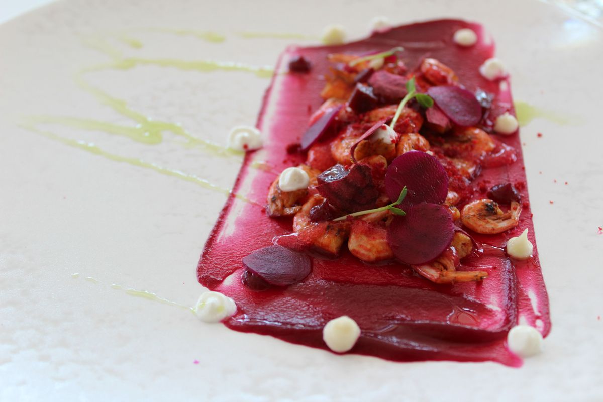 Καρπάτσιο τόνου με σούμα από τα Σιάννα, γαριδάκι λινδιακό σε υφές από παντζάρι, χταπόδι στιφάδο με λουκάνικο Έμπωνας, λαιμός αρνί αργοψημένος στη σάλτσα του με δεντρολίβανο