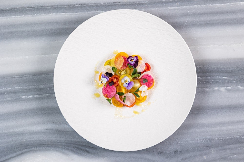 Τα ίδια γοητευτικά στοιχεία τα ξαναβρήκα στα ντελικάτα καλωσορίσματά του: ένα τουίλ σαν δαντελένιο φύλλο με μασκαρπόνε και κρέμα ντομάτας και ένα ταρτάκι με ταρτάρ κόκκινης γαρίδας, αυγά πέστροφας με κρέμα φλερέτ αρακά. Ο κήπος λαχανικών, η μικρή πράσινη σαλάτα που άνοιξε ευχάριστα το δείπνο, με το μαύρο, τραγανό αυγό ορτυκιού, τσιπς από παστινάκη, πίκλες καρότου και τρούφα έπαιζε έξυπνα το παιχνίδι των υφών και της αντίθεσης. Πιο άτονο βρήκα το φουαγκρά με το γλάσο αμυγδάλου και κερασιών, που παρά το ενδιαφέρον τσάτνεϊ ντομάτας-Vinsanto δεν κατάφερνε να «συνομιλήσει» με τη σκόνη από τσάι μάτσα.