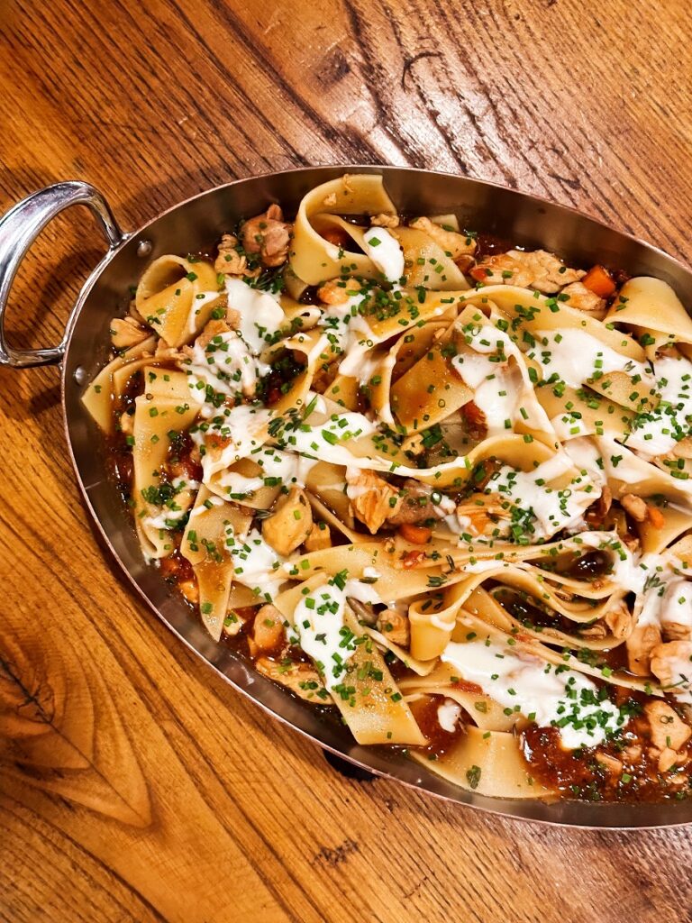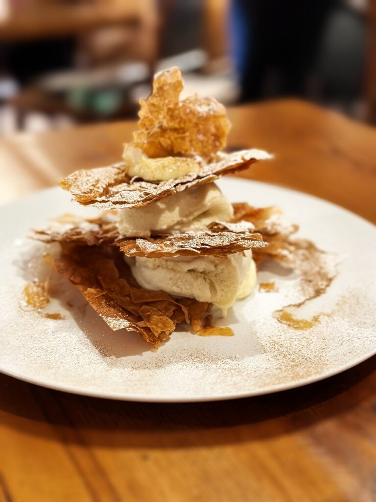 Το παιχνιδιάρικο fondue, με τυρί gruyere, racklete και emmental αλλά και διακριτική προσθήκη τρούφας, παρουσιάστηκε αχνιστό σε μαντεμένιο σκεύος πάνω σε συσκευή ρεσό, συνοδευόμενο από κύβους φρυγανισμένου ψωμιού, μανιτάρια και ψητές πατάτες, έτοιμα να βουτηχτούν στο λιωμένο μείγμα τυριών. Εξαιρετική και η σπιτική bolognaise με παπαρδέλες, κόκορα και κρέμα γραβιέρας καθώς και τα ζουμερά, σιγομαγειρεμένα σε port, μοσχαρίσια μάγουλα με κρεμώδη πολέντα πορτοκαλιού. Ο δημοφιλής γύρος έκανε μια θεαματική άνοδο στη σκηνή του γεύματός μας μέσα σε ξύλινο σκεύος με καλοψημένο μοσχαρίσιο black angus, τραγανή λαδόπιτα, ντοματίνια κονφί, πίκλα κρεμμύδι και κρέμα τυριού πασπαλισμένη με πάπρικα. Το δείπνο μας ολοκλήρωσε το αποδομημένο τραγανό και βουτυράτο γαλακτομπούρεκο με καραμελωμένα φύλλα κανέλας και παγωτό βανίλια.