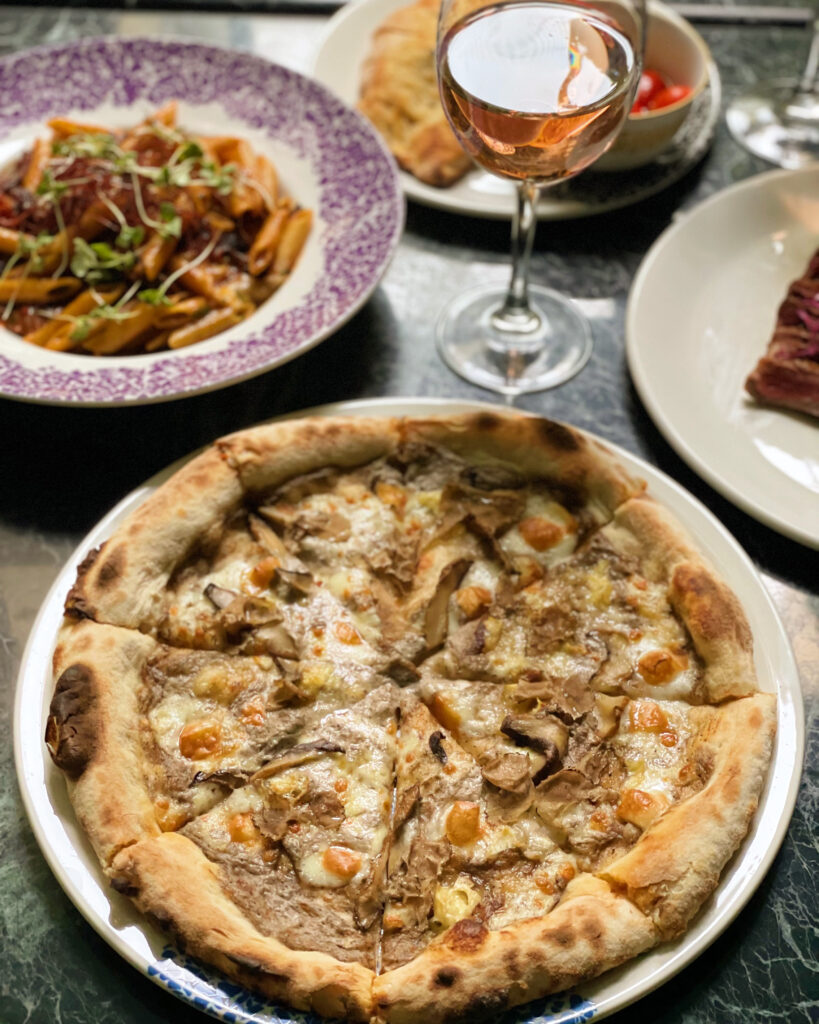 Beef carpaccio και tartar, vitello tonnato με καλομαγειρεμένο κρέας και δεμένη σάλτσα τόνου αλλά και μια ψητή μελιτζάνα με νεροκάρδαμο, ντομάτα, βασιλικό και ρικότα που πρώτη φορά δοκιμάζαμε και βρήκαμε γοητευτικά αρωματική συνθέτουν την πλειοψηφία των πρώτων επίλογων. Η πίτσα φτιάχνεται με ζυμάρι 24ωρης ωρίμανσης εύπεπτη με καλοσχηματισμένο στεφάνι cornicione) με μικρότερη κυψέλωση και ελαφρύ πάχος στην επιφάνεια με όλες τις κλασικές συνταγές να φωνάζουν παρών, ενώ η τραγανή πορκέτα με καρότο και σάλτσα πορτοκαλιού και η tagliata με πολέντα, τρούφα και παρμεζάνα πρωταγωνιστούν στην κατηγορία κρέας.