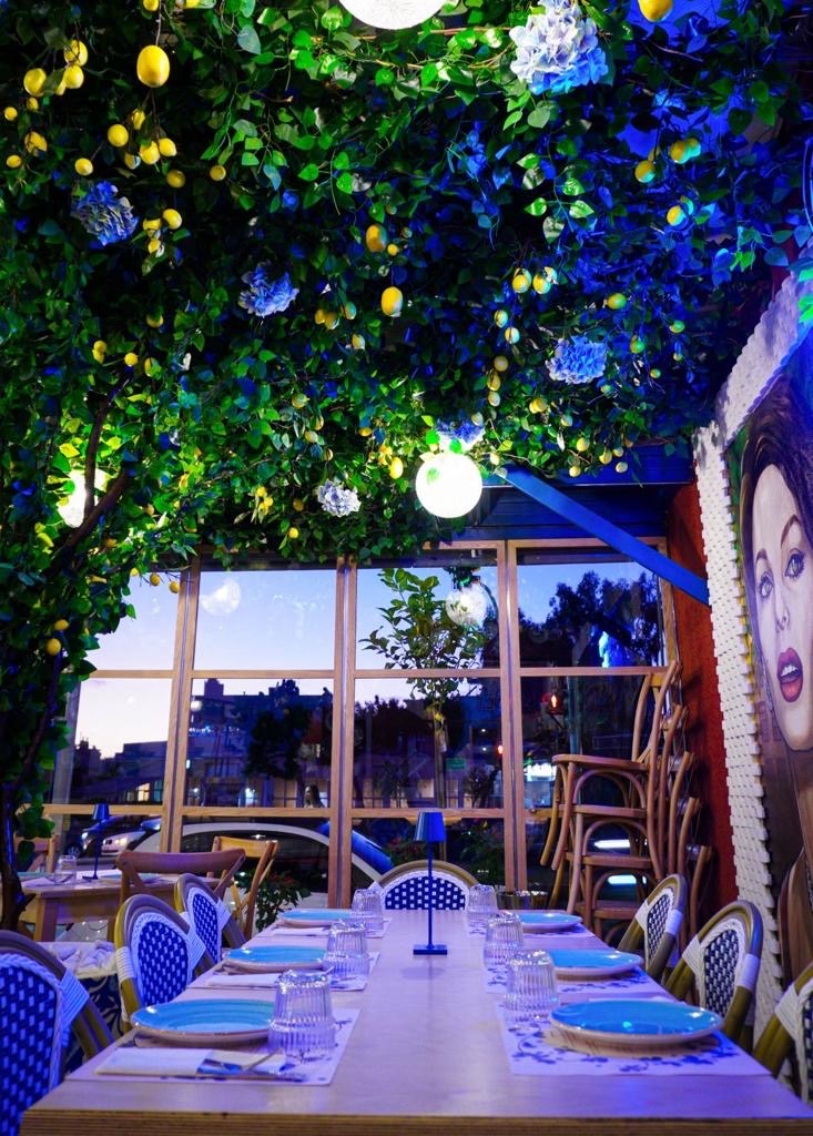 Το Mamy Blue έκανε την εμφάνιση του σε μια πολυσύχναστη γωνιά της Άνω Γλυφάδας -εκεί που η οδός Ανδρέα Παπανδρέου συναντάει την Βασιλίσσης Όλγας- στα τέλη της προηγούμενης χρονιάς. Διακοσμημένη με λεμονιές, ορτανσίες και κεραμικά pots με φρέσκους βασιλικούς, η σάλα του εστιατορίου μοιάζει με σπιτική αυλή, αποκομμένη από τη βοή και τους γρήγορους ρυθμούς της πόλης. Το βλέμμα τραβούν ο χτιστός ξυλόφουρνος και οι τοιχογραφίες μιας από τις μεγαλύτερες ντίβες του ιταλικού κινηματογράφου, της Σοφίας Λόρεν καθώς και του Ντιέγκο Μαραντόνα, του Αργεντινού θρύλου των γηπέδων που δήλωνε για χρόνια ως έδρα του τη ζωηρή Νάπολη.