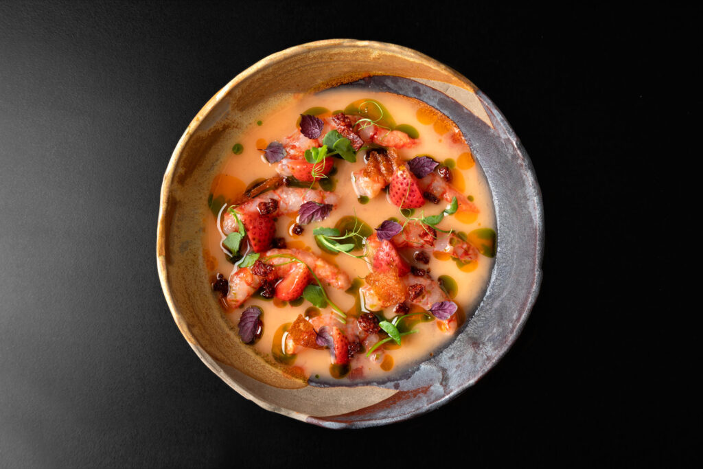 Χαζεύοντας τον κατάλογο του φαγητό απολάμβανα ένα ποτήρι sake, αυτό το ιαπωνικό απόσταγμα από ρύζι που μοιάζει με κρασί και λίγα edamame τα οποία έρχονται ζεστά με την καυτερή σάλτσα τσίλι. Με μια πρώτη ματιά η επιλογή των πιάτων φάνταζε δύσκολη, καθώς υπήρχαν πολλά πιάτα που μου τράβηξαν την προσοχή. Αρχίσαμε με την σαλάτα με καπνιστή πέστροφα, παντζάρι και αγκινάρα Ιερουσαλήμ, άγριο μπρόκολο και μανιτάρια σε μια σάλτσα από ταχίνι που έδενε όλα τα στοιχεία με μαεστρία. Ωραία σε εντάσεις, με τα λαχανικά να μην χάνουν την φρεσκάδα τους, που δεν σε άφηνε να την αφήσεις. Συνεχίσαμε τα με τις ωμές γαρίδες Κοιλάδος που «κολυμπούσαν» σε ένα έντονο leche de tigre και συνοδεύονταν από τσορίθο Δράμας.