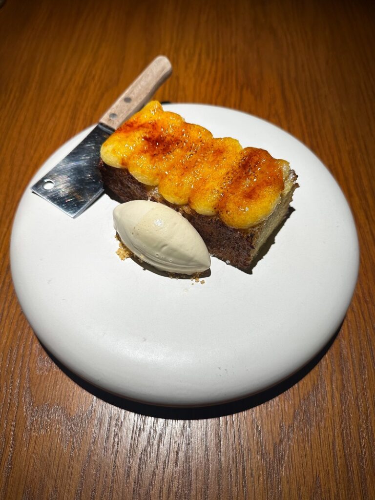 Εμπνευσμένο από το θεσσαλονικιώτικο τσουρέκι και την κρεμ μπρουλέ ήταν το καραμελωμένο τσουρέκι με μαχλέπι που έκλεισε το γεύμα μου – ανάλαφρο μπριός, ενισχυμένο με μαχλέπι και γεμισμένο με κρέμα πατισερί, η επιφάνεια της οποίας ήταν καλυμμένη με καραμελωμένη ζάχαρη.